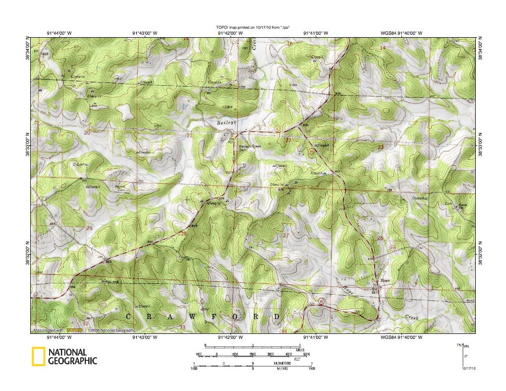 Figure 4: Detailed map of Baileys Creek-Richland Creek drainage divide area. United States Geological Survey map digitally presented using National Geographic Society TOPO software.