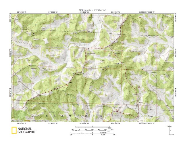 Figure 3: Baileys Creek-Gasconade River drainage divide area. United States Geological Survey map digitally presented using National Geographic Society TOPO software.