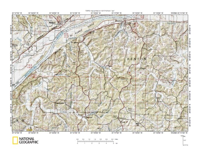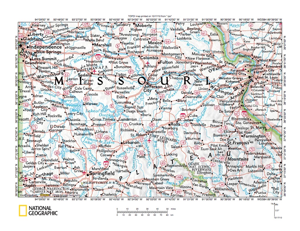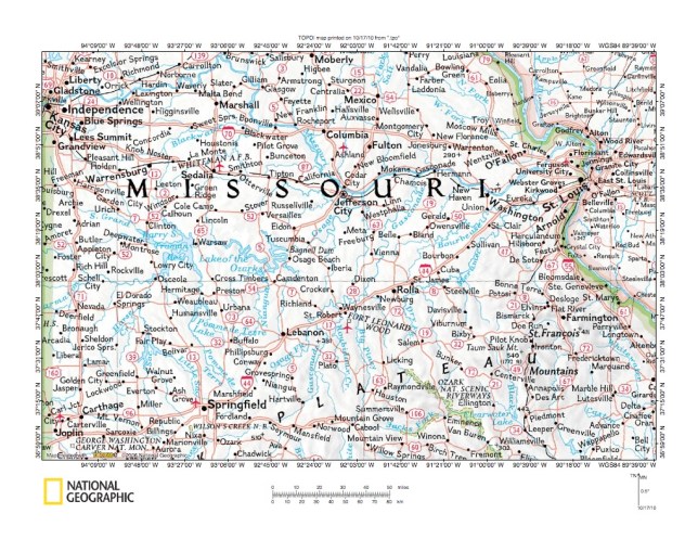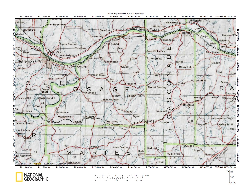 Figure 1: Missouri River-Gasconade River drainage divide area location map. National Geographic Society map digitally presented using National Geographic Society TOPO software.