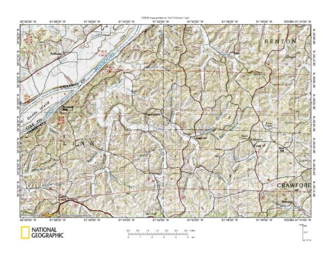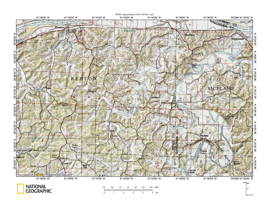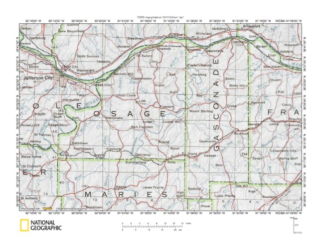 Figure 2: Missouri River-Gasconade River drainage divide area detailed location map. United States Geological Survey map digitally presented using National Geographic Society TOPO software.