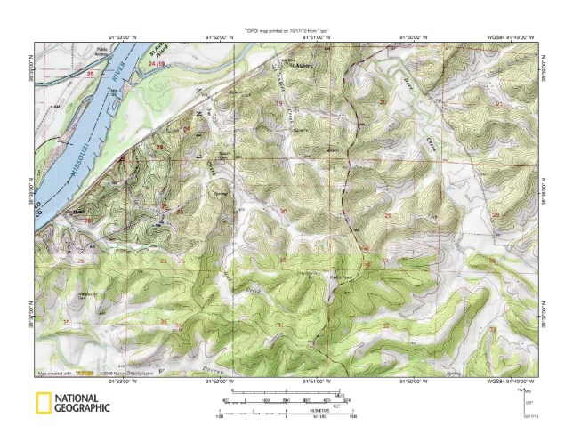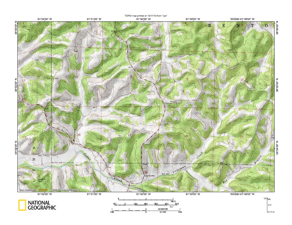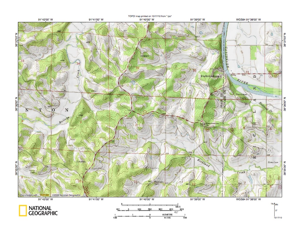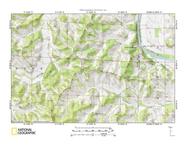 Figure 9: Cedar Creek-Gasconade River drainage divide area. United States Geological Survey map digitally presented using National Geographic Society TOPO software.