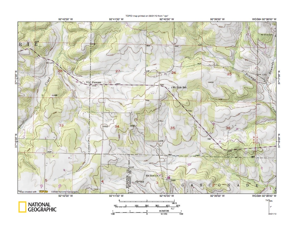 Figure 3: North end of Osage Fork (Gasconade River)-Gasconade River drainage divide area. United States Geological Survey map digitally presented using National Geographic Society TOPO software.