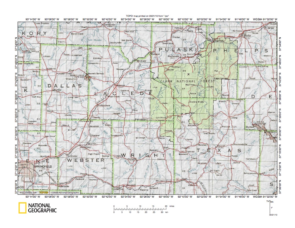 Figure 1: Osage Fork (Gasconade River)-Gasconade River drainage divide area location map (select and click on maps to enlarge). National Geographic Society map digitally presented using National Geographic Society TOPO software.