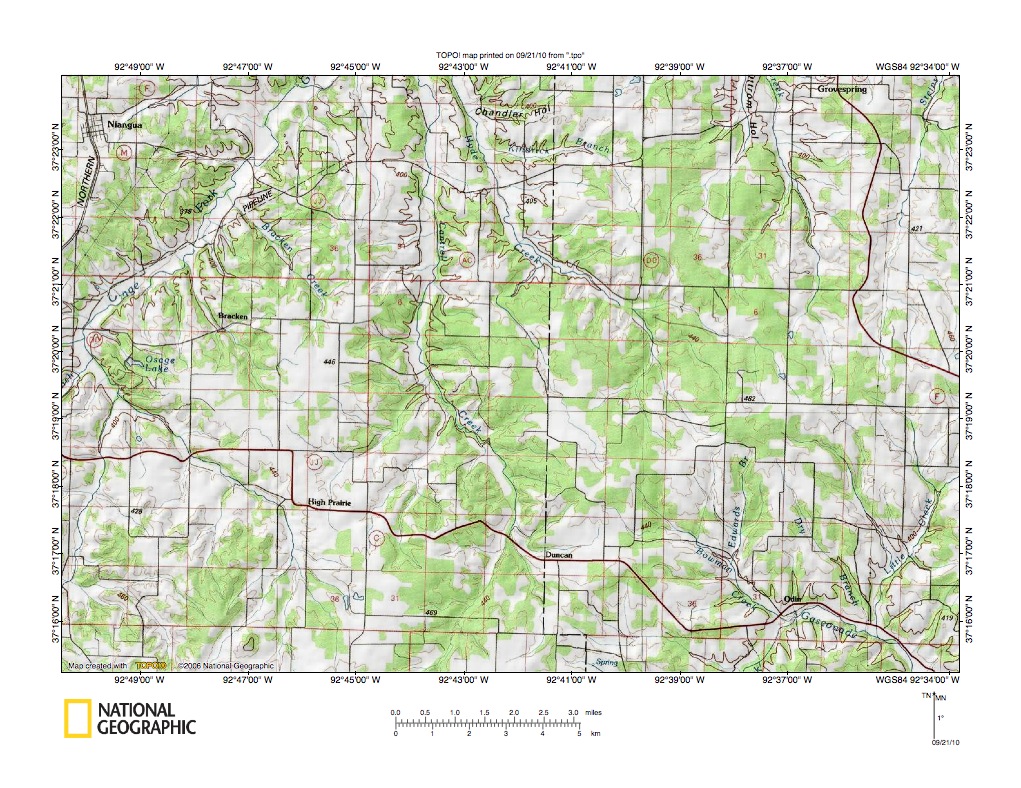 Figure 9: Osage Fork (Gasconade River)-Woods Fork (Gasconade River) drainage divide area. United States Geological Survey map digitally presented using National Geographic Society TOPO software.