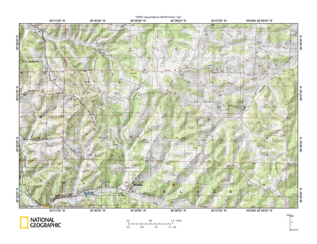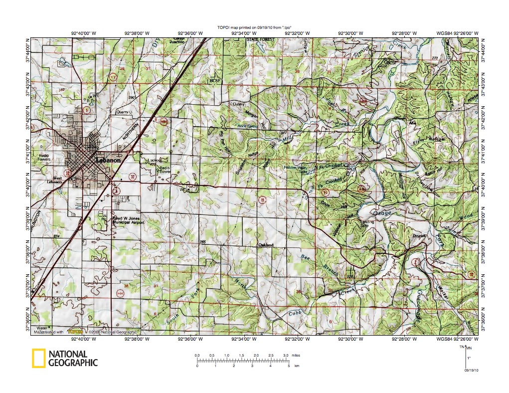 Figure 9a: Map showing region south and east of Lebanon, Missouri. United States Geological Survey map digitally presented using National Geographic Society TOPO software.