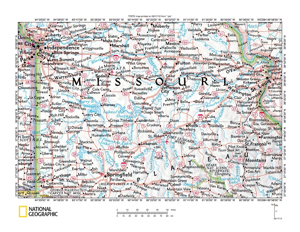 Figure 1: Osage River-Dry Auglaize Creek drainage divide area location map (select and click on maps to enlarge). National Geographic Society map digitally presented using National Geographic Society TOPO software.