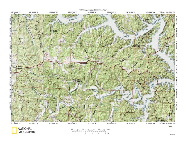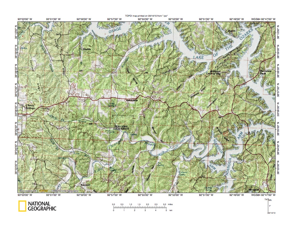 Figure 3: Osage River-Little Niangua River drainage divide at Lake of Ozarks. United States Geological Survey map digitally presented using National Geographic Society TOPO software.