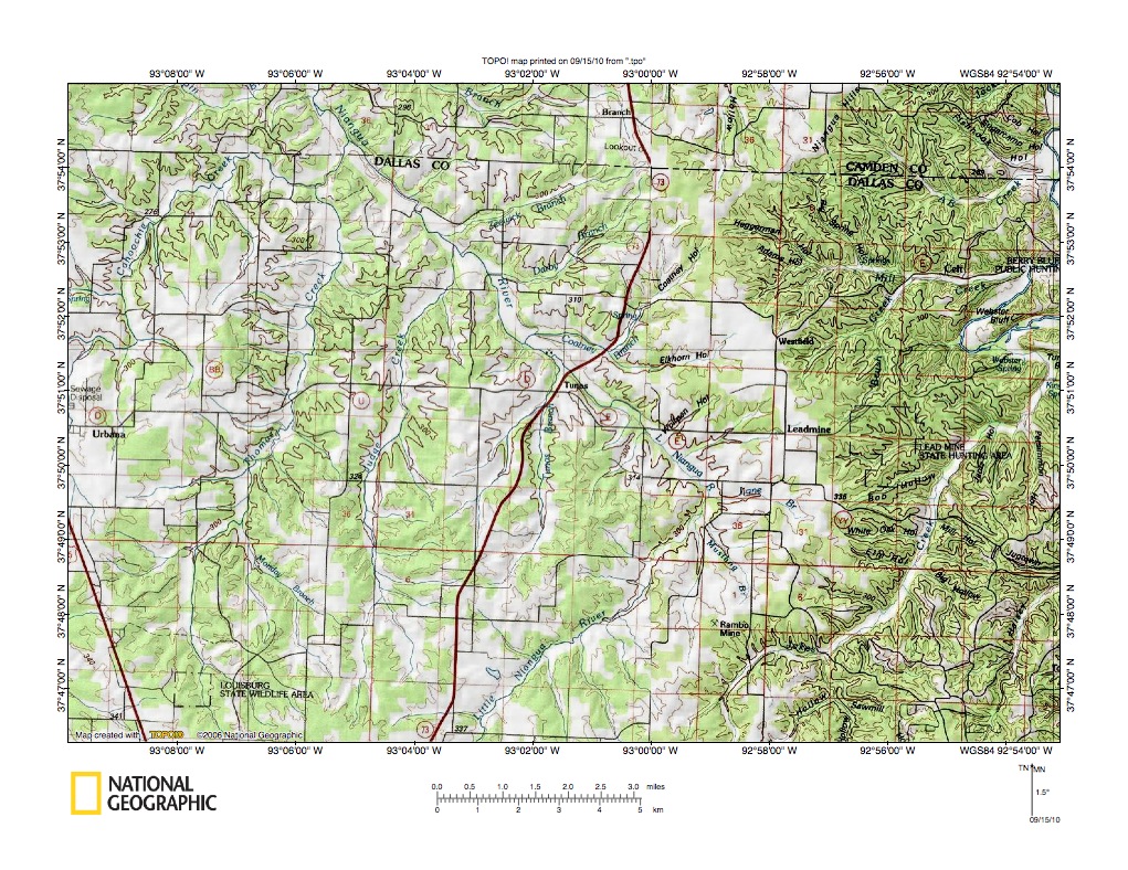 Figure 9: Little Niangua River-Niangua River drainage divide area. United States Geological Survey map digitally presented using National Geographic Society TOPO software.