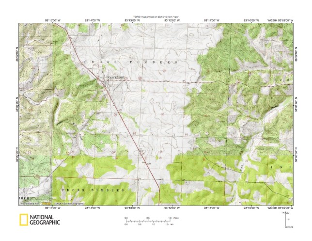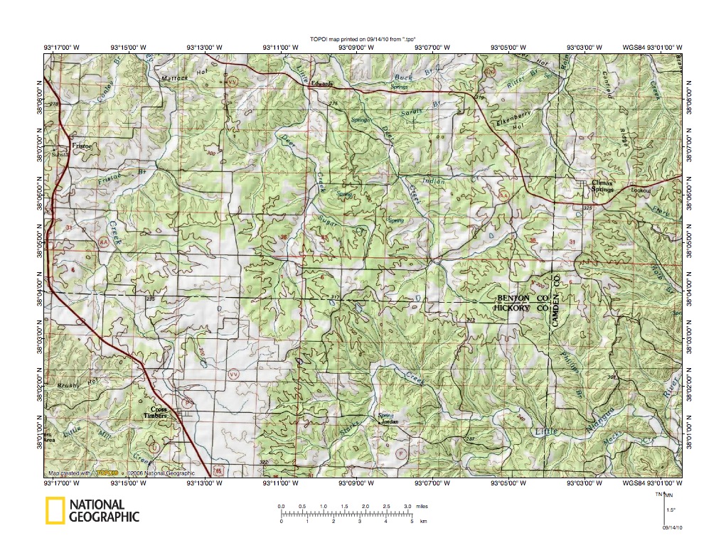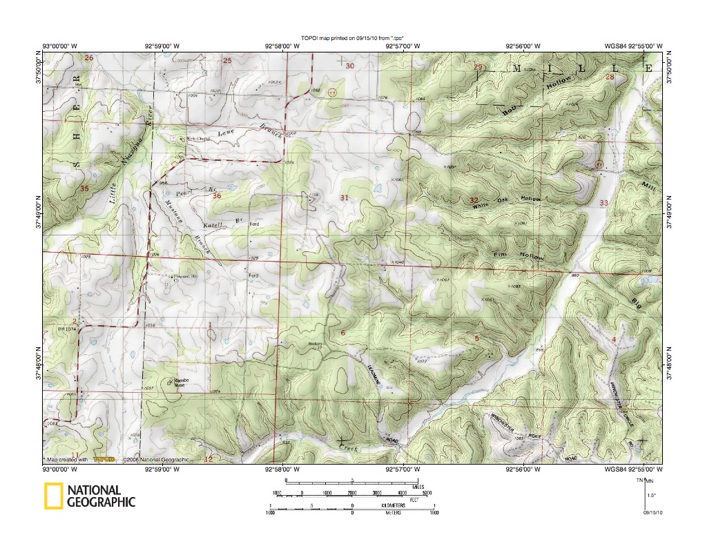Figure 10: Detailed map of Little Niangua River-Jakes Creek drainage divide area. United States Geological Survey map digitally presented using National Geographic Society TOPO software.