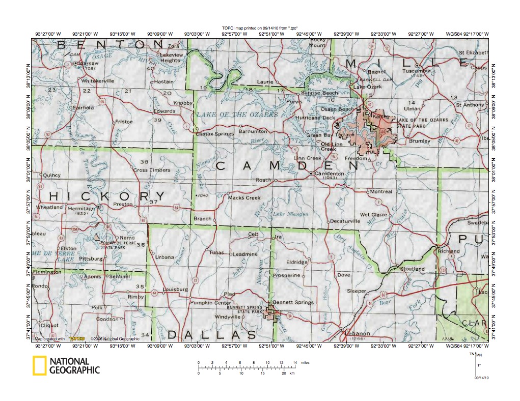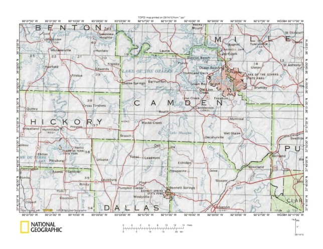 Figure 2: Osage River-Little Niangua River drainage divide area detailed location map. United States Geological Survey map digitally presented using National Geographic Society TOPO software.