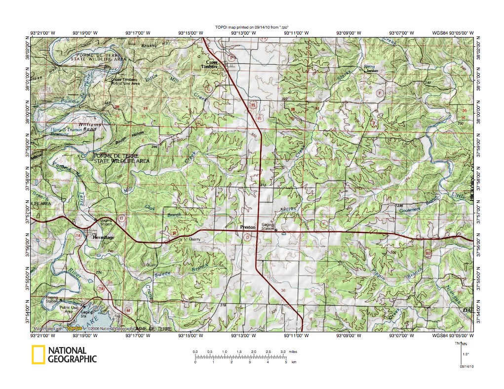 Figure 7: Pomme de Terre River-Little Niangua River drainage divide area. United States Geological Survey map digitally presented using National Geographic Society TOPO software.