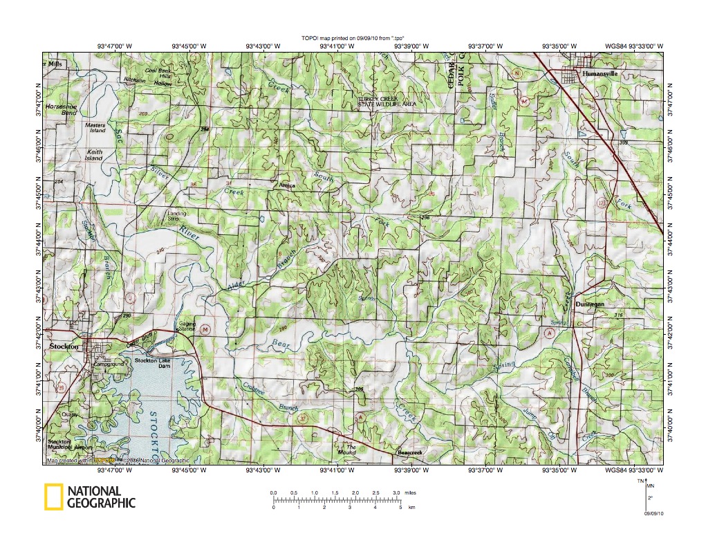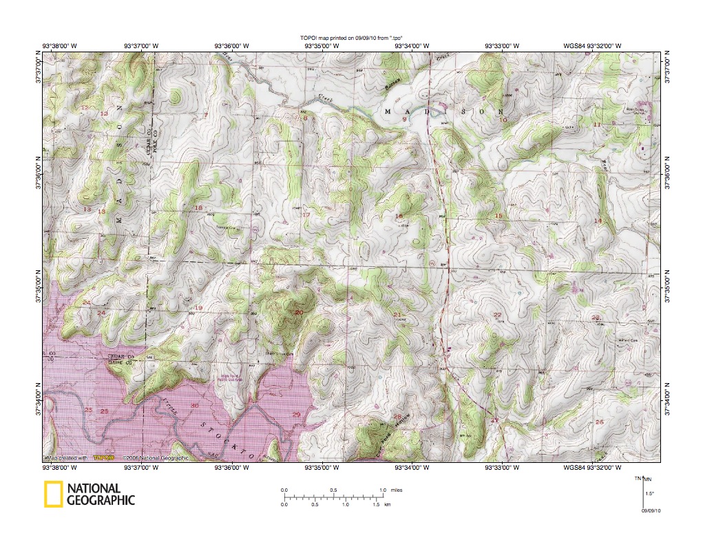 Figure 9: Bear Creek-Little Sac River drainage divide area. United States Geological Survey map digitally presented using National Geographic Society TOPO software.