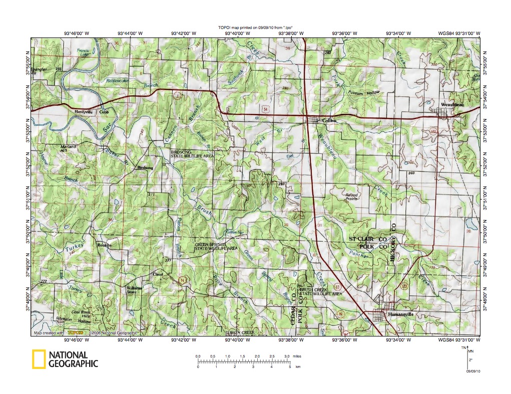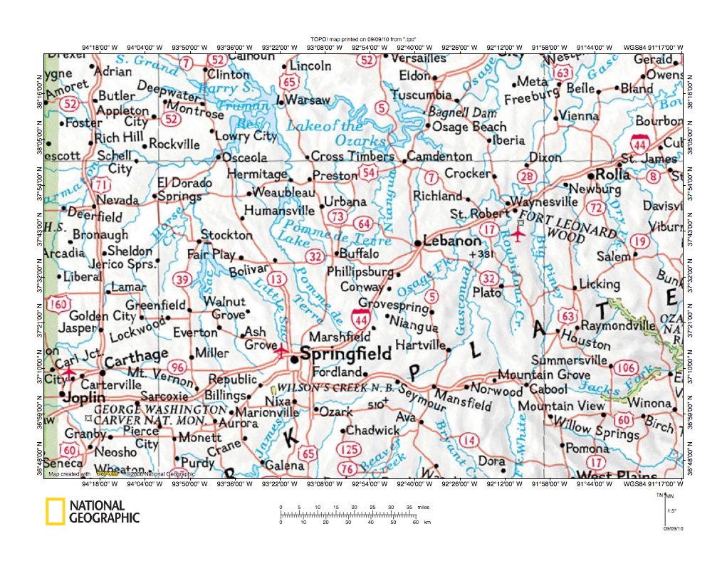 Figure 1: Weaubleau Creek-Little Sac River drainage divide area location map (select and click on maps to enlarge). National Geographic Society map digitally presented using National Geographic Society TOPO software.