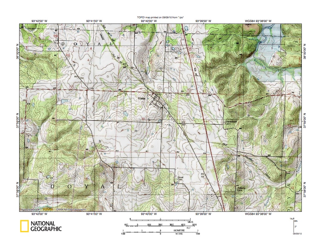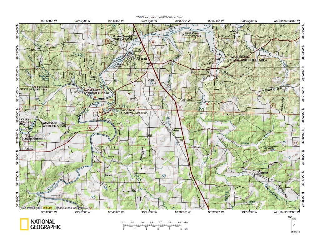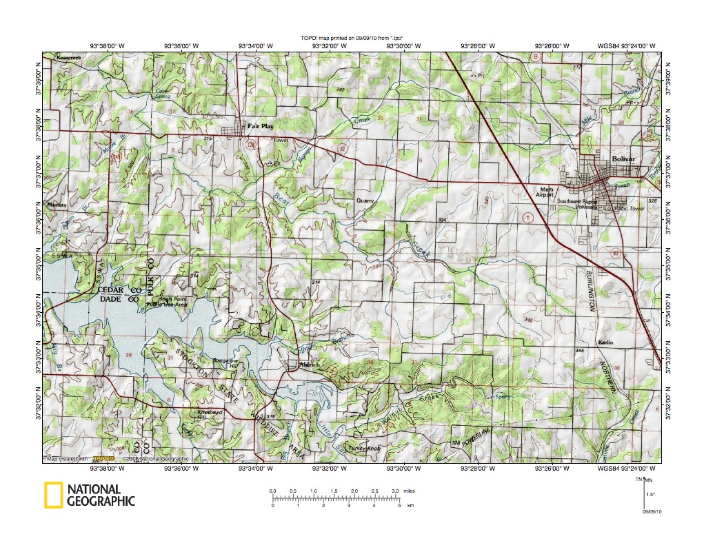 Figure 3: Sac River-Weaubleau Creek drainage divide area. United States Geological Survey map digitally presented using National Geographic Society TOPO software.