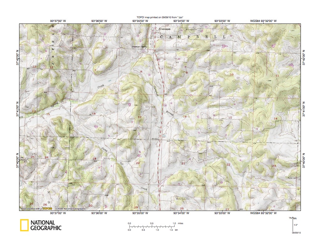 Figure 5: Coon Creek-Brush Creek drainage divide area. United States Geological Survey map digitally presented using National Geographic Society TOPO software.