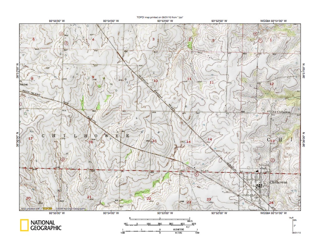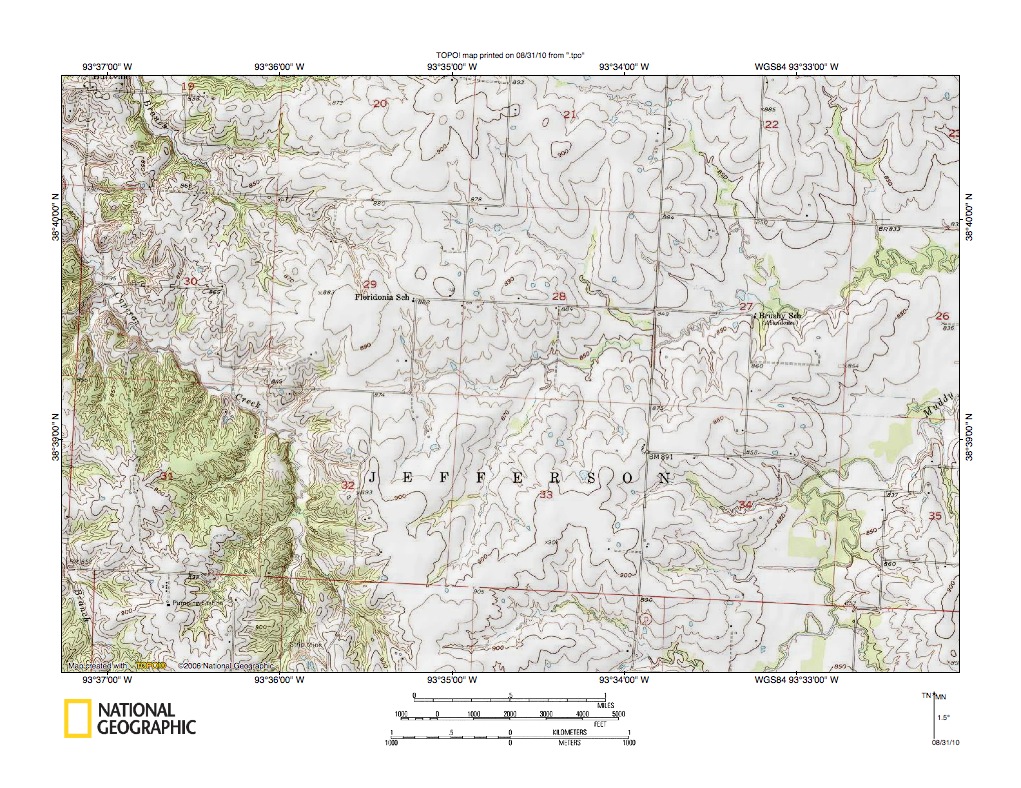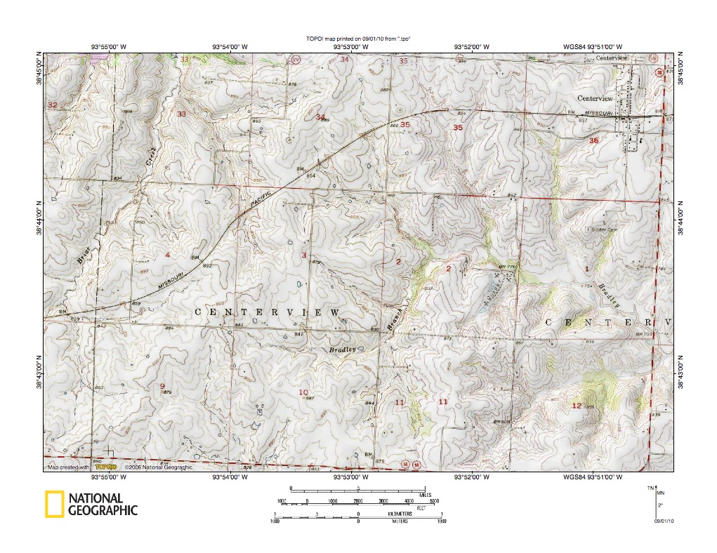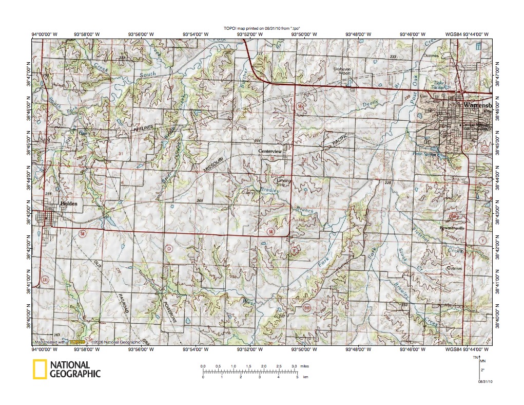 Figure 9: Clear Fork-Tebo Creek drainage divide area. United States Geological Survey map digitally presented using National Geographic Society TOPO software.