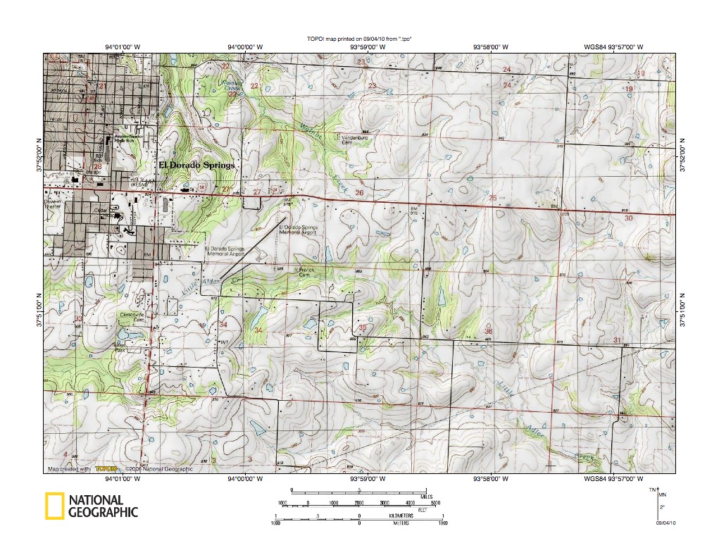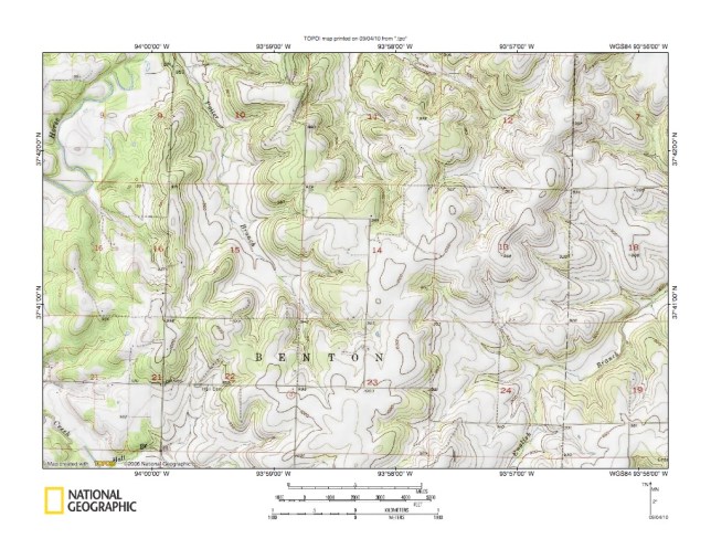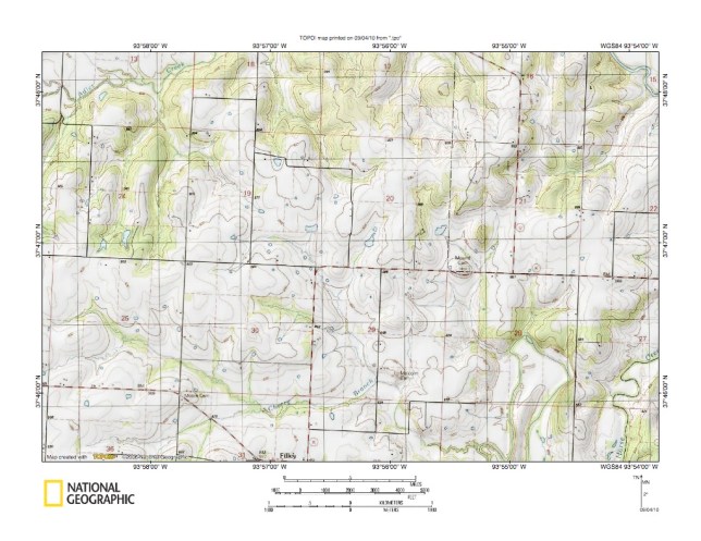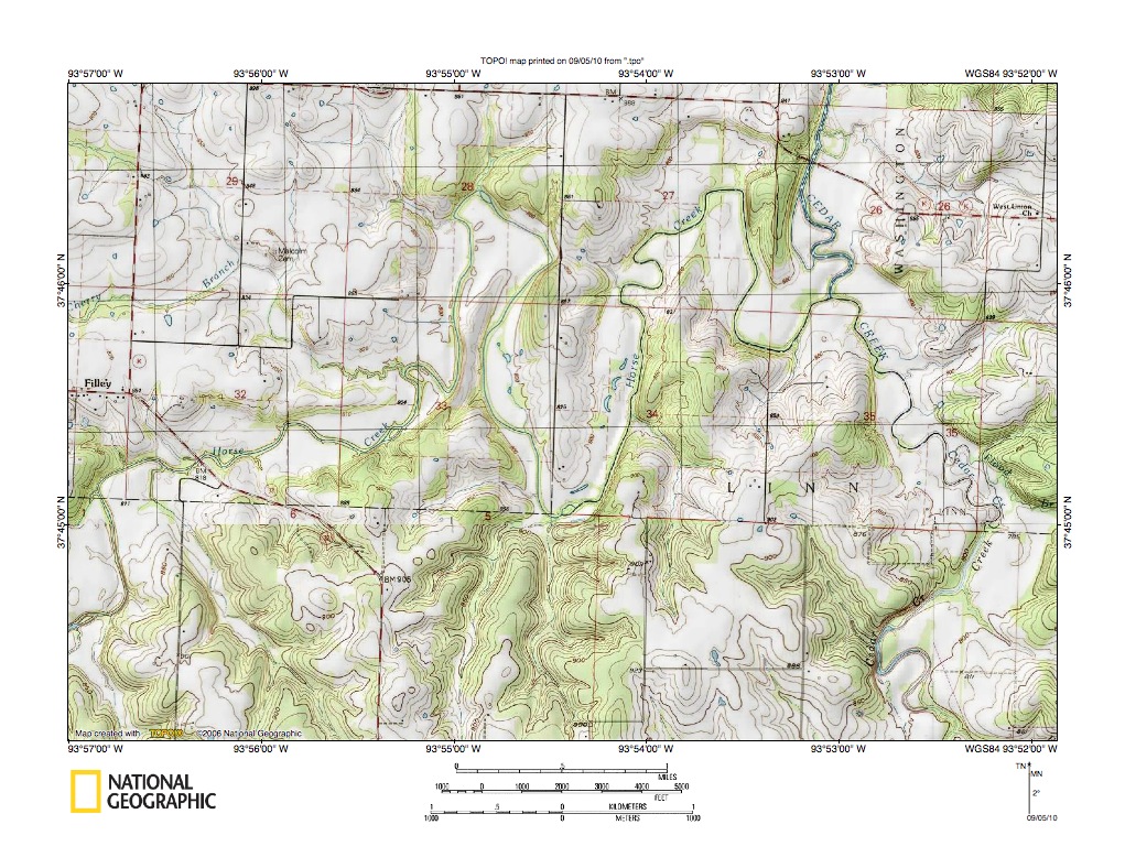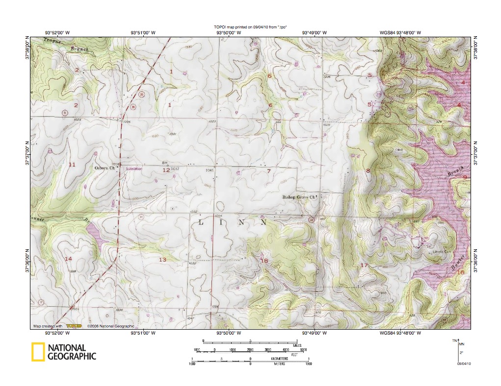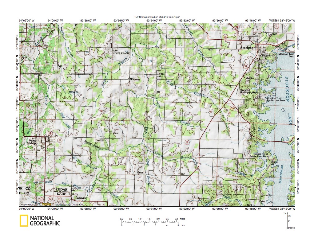 Figure 9: Cedar Creek-Sac River drainage divide area. United States Geological Survey map digitally presented using National Geographic Society TOPO software.