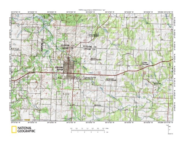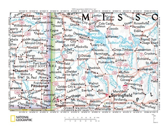 Figure 1: Clear Creek-Sac River drainage divide area location map (select and click on maps to enlarge). National Geographic Society map digitally presented using National Geographic Society TOPO software.