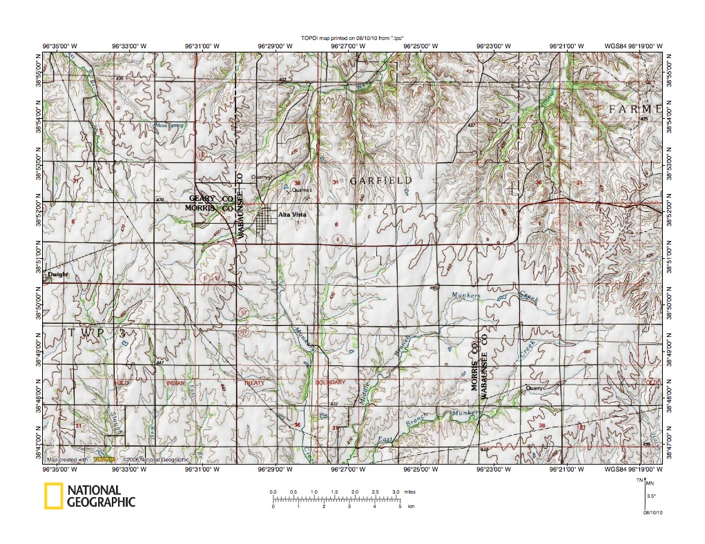 Figure 3: Clarks Creek-Neosho River drainage divide area. United States Geological Survey map digitally presented using National Geographic Society TOPO software.