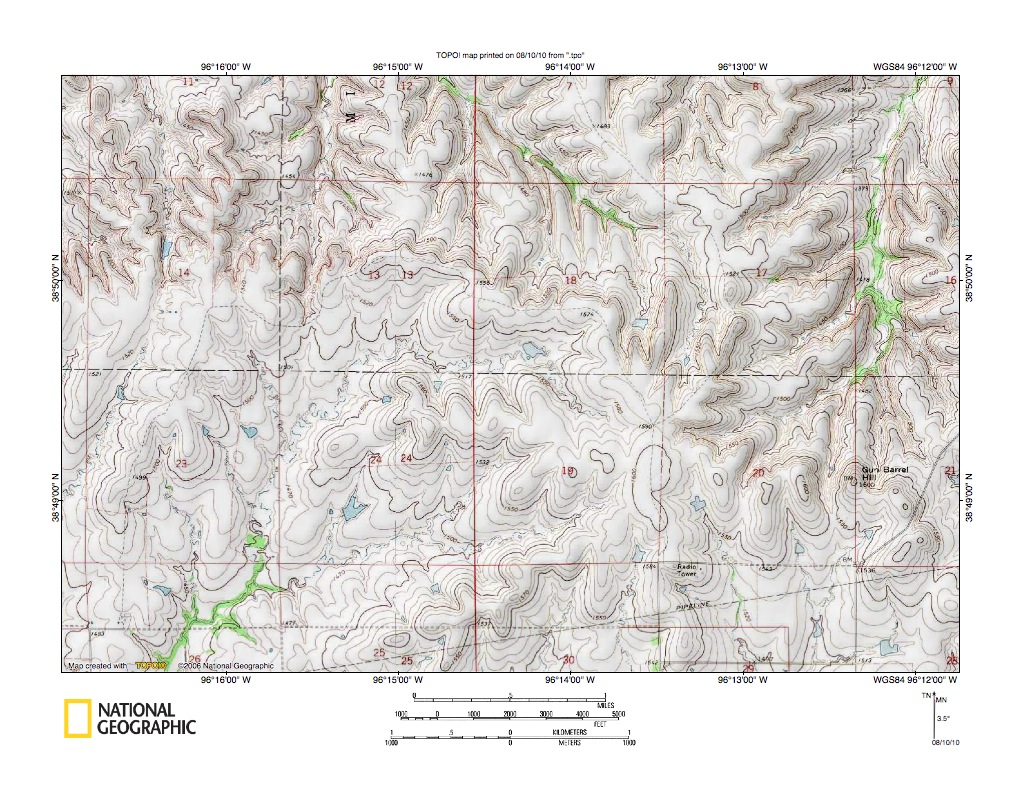 Figure 9: Kansas River-Mill Creek drainage divide area. United States Geological Survey map digitally presented using National Geographic Society TOPO software.