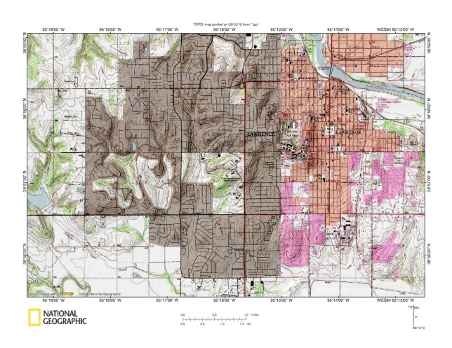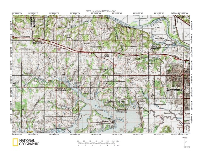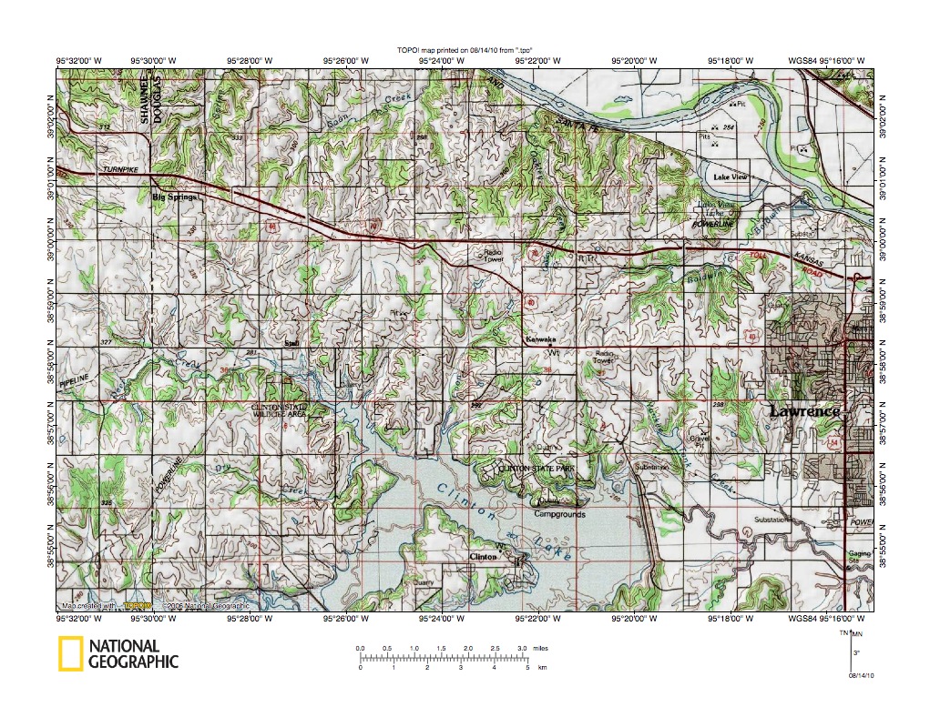 Figure 3: Kansas River-Wakarusa River drainage divide area. United States Geological Survey map digitally presented using National Geographic Society TOPO software.