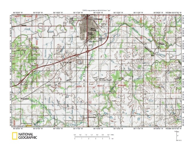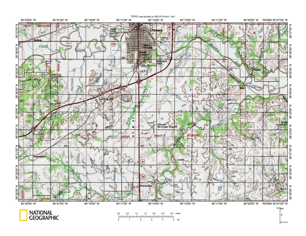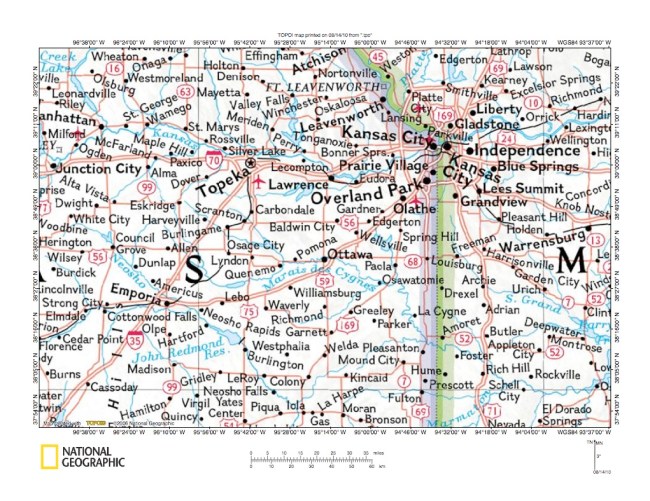 Figure 1: Kansas River-Pottawatomie Creek drainage divide area location map (select and click on maps to enlarge). National Geographic Society map digitally presented using National Geographic Society TOPO software.
