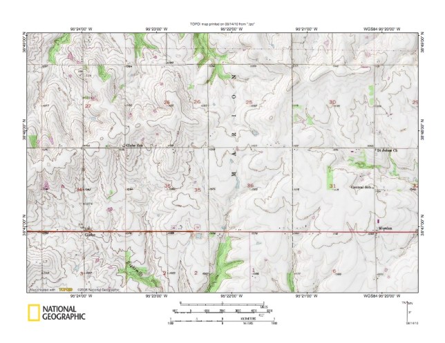 Figure 5: Wakarusa River-Marais des Cygnes River drainage divide area. United States Geological Survey map digitally presented using National Geographic Society TOPO software.