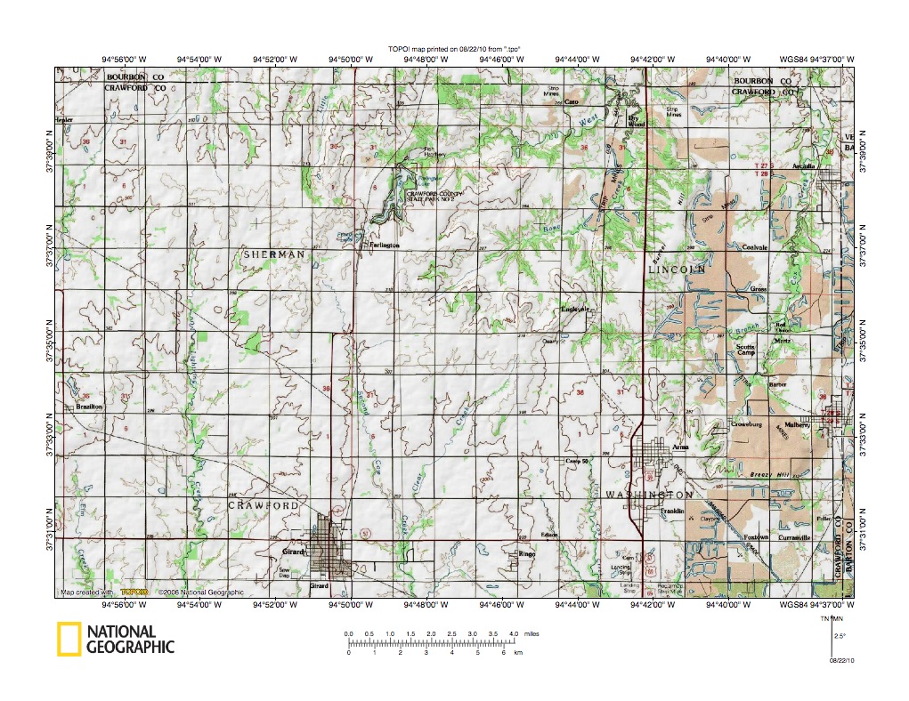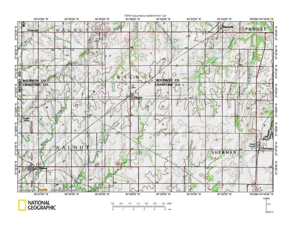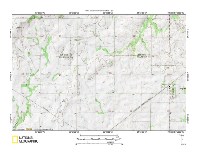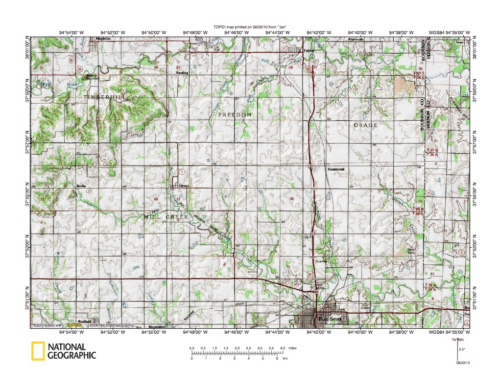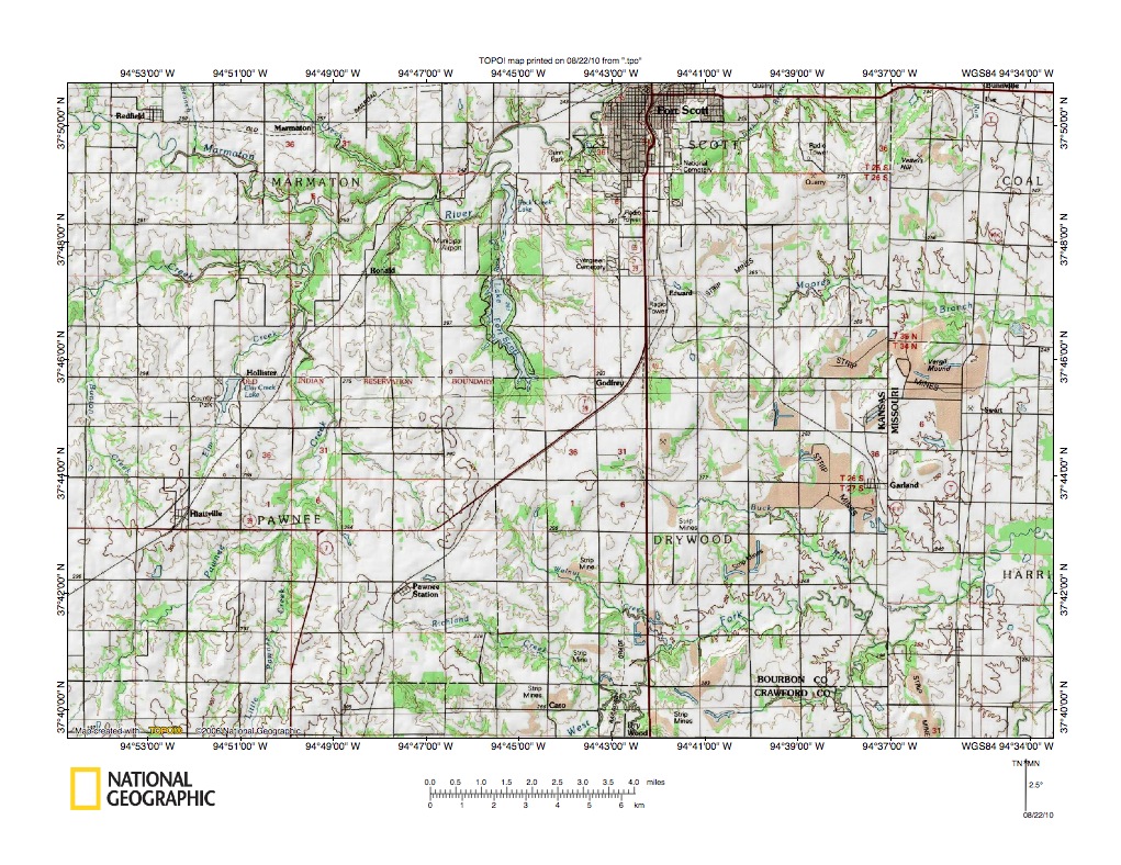 Figure 7: Marmaton River-West Fork Dry Wood Creek drainage divide area. United States Geological Survey map digitally presented using National Geographic Society TOPO software.