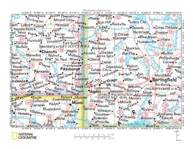 Figure 1: Little Osage River-Neosho River drainage divide area location map (select and click on maps to enlarge). National Geographic Society map digitally presented using National Geographic Society TOPO software