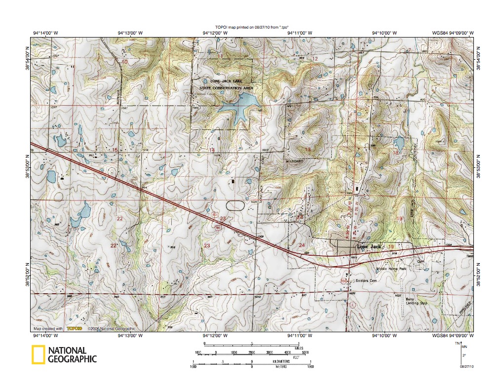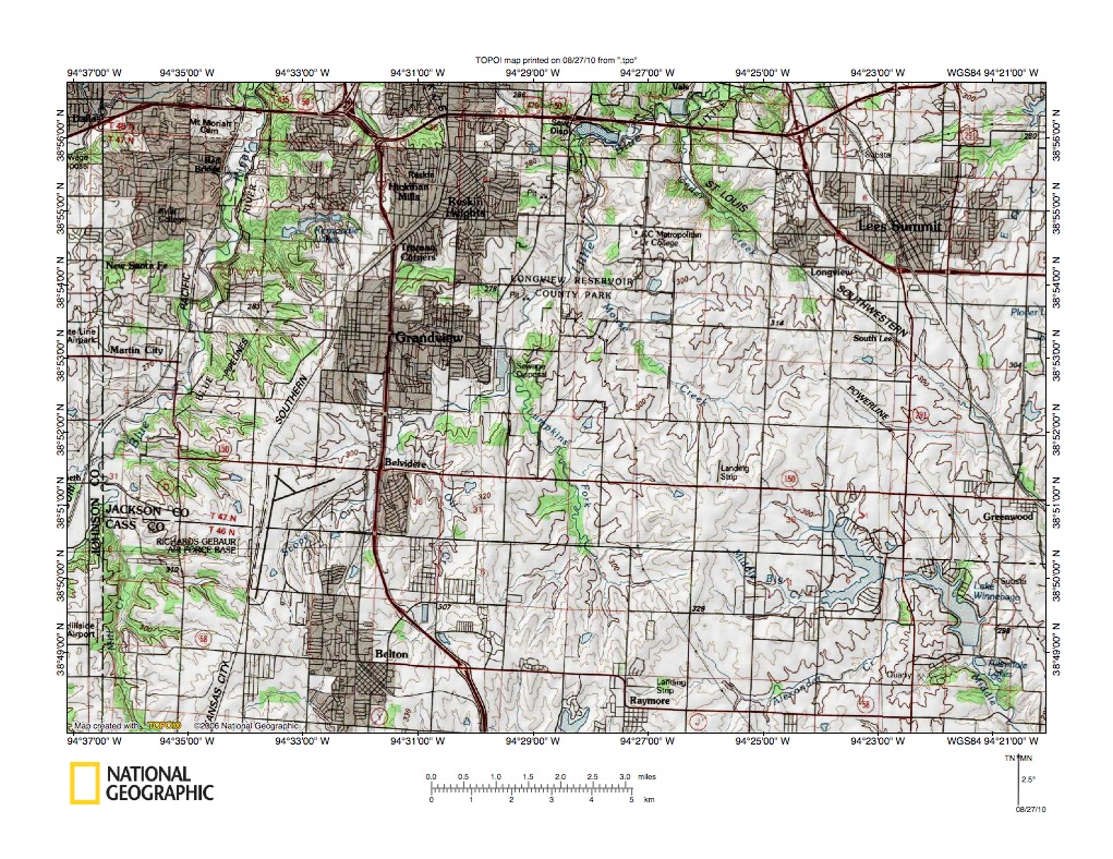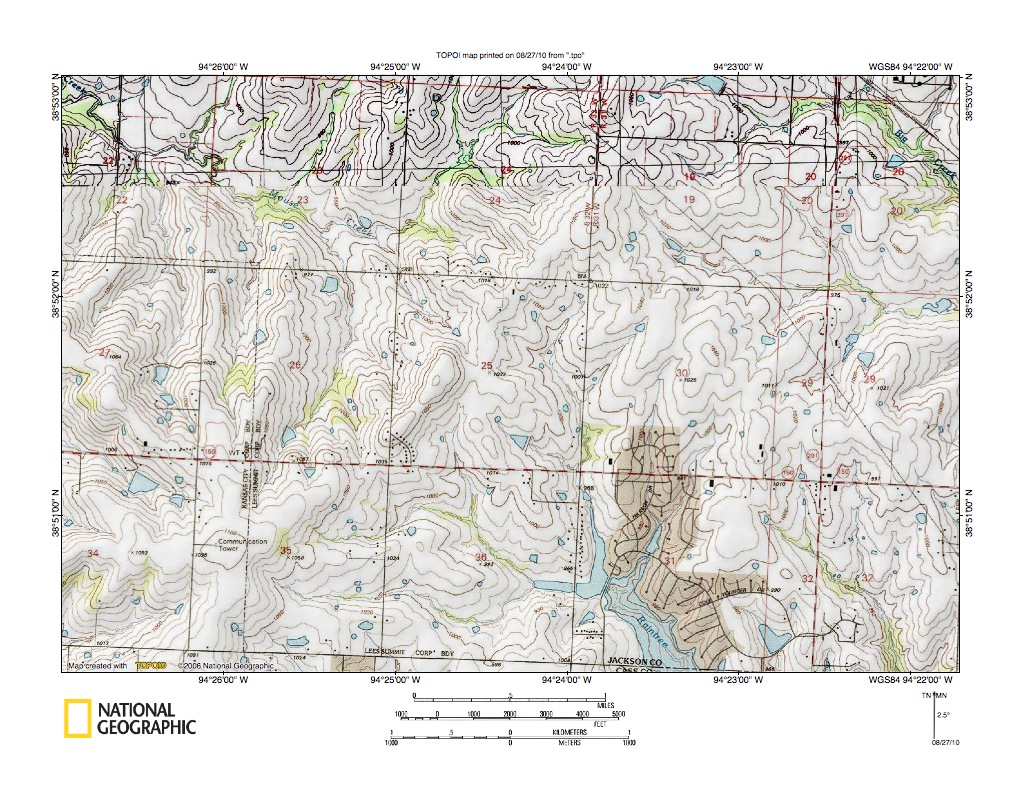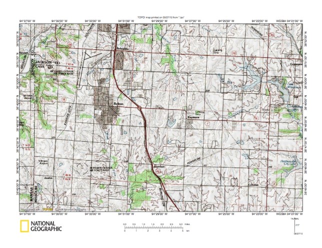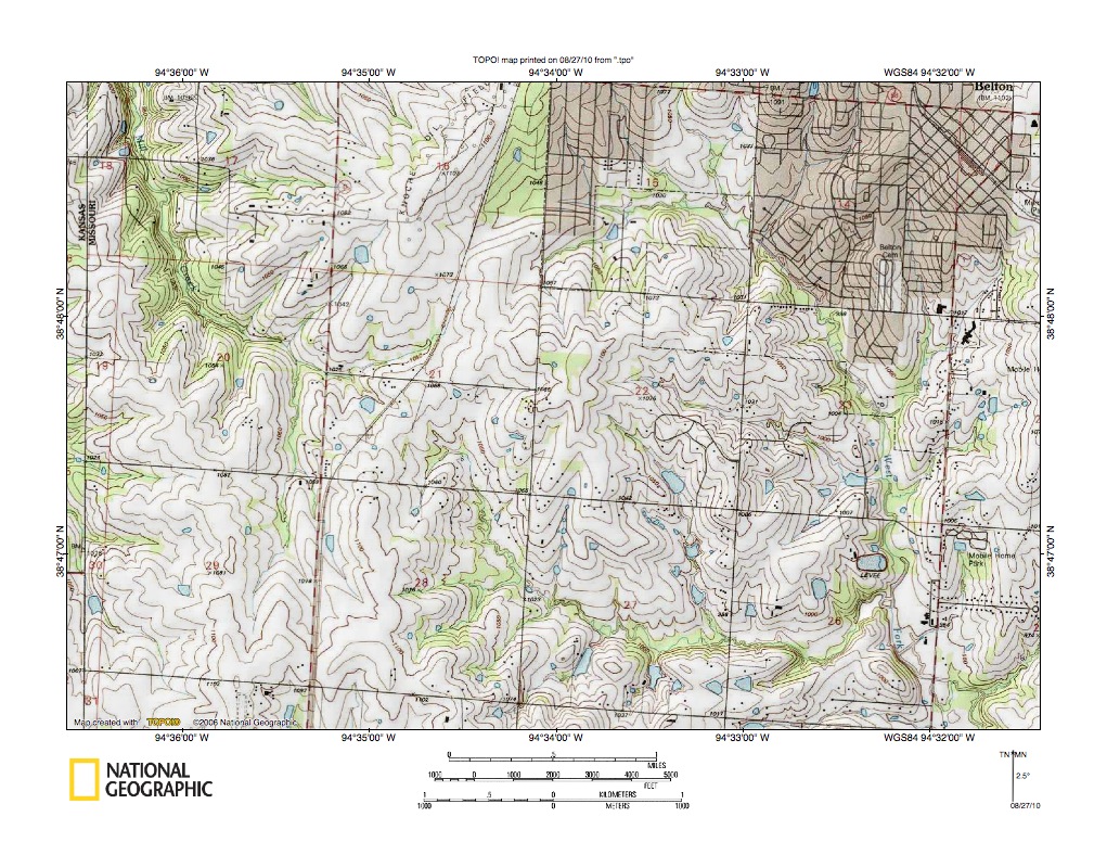Figure 3: Little Blue River-South Grand River drainage divide area. United States Geological Survey map digitally presented using National Geographic Society TOPO software.