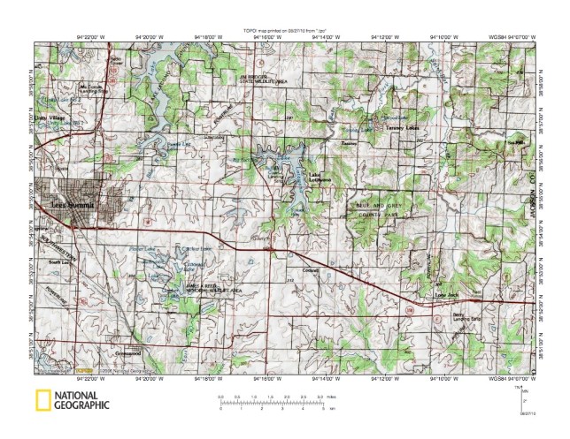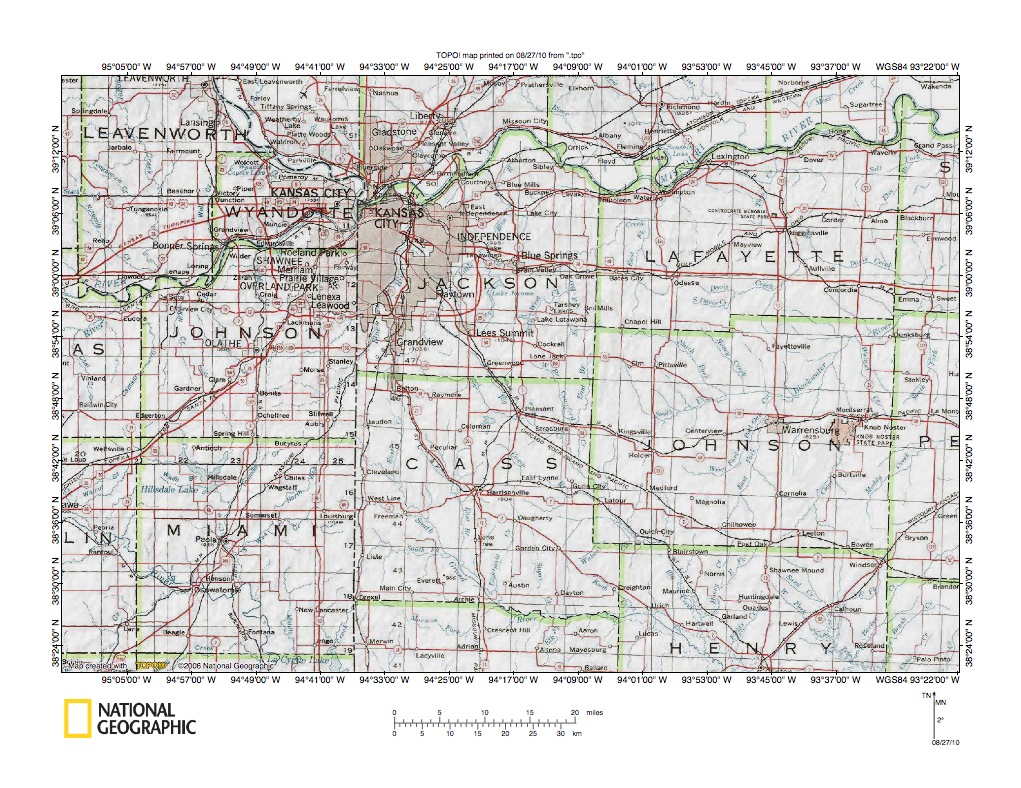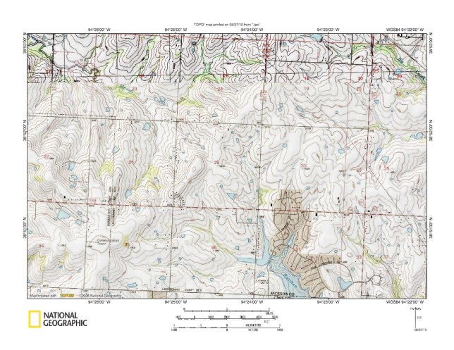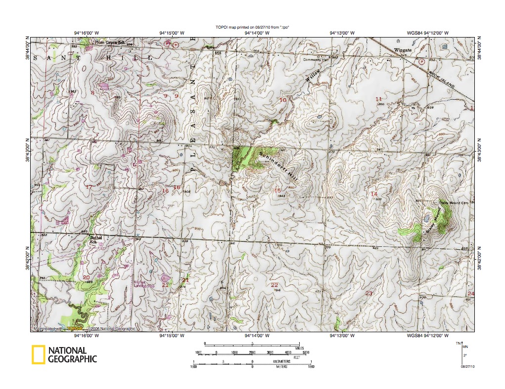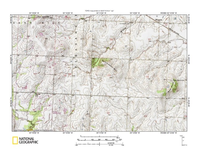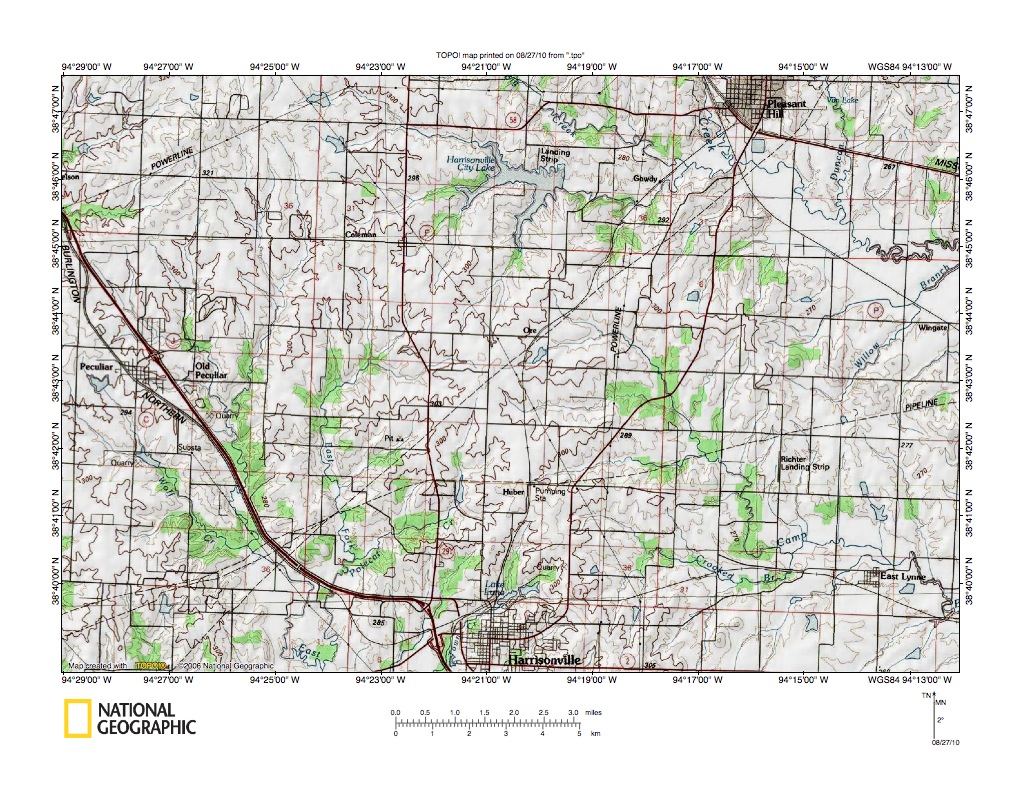 Figure 3: Little Blue River-South Grand River drainage divide area. United States Geological Survey map digitally presented using National Geographic Society TOPO software.