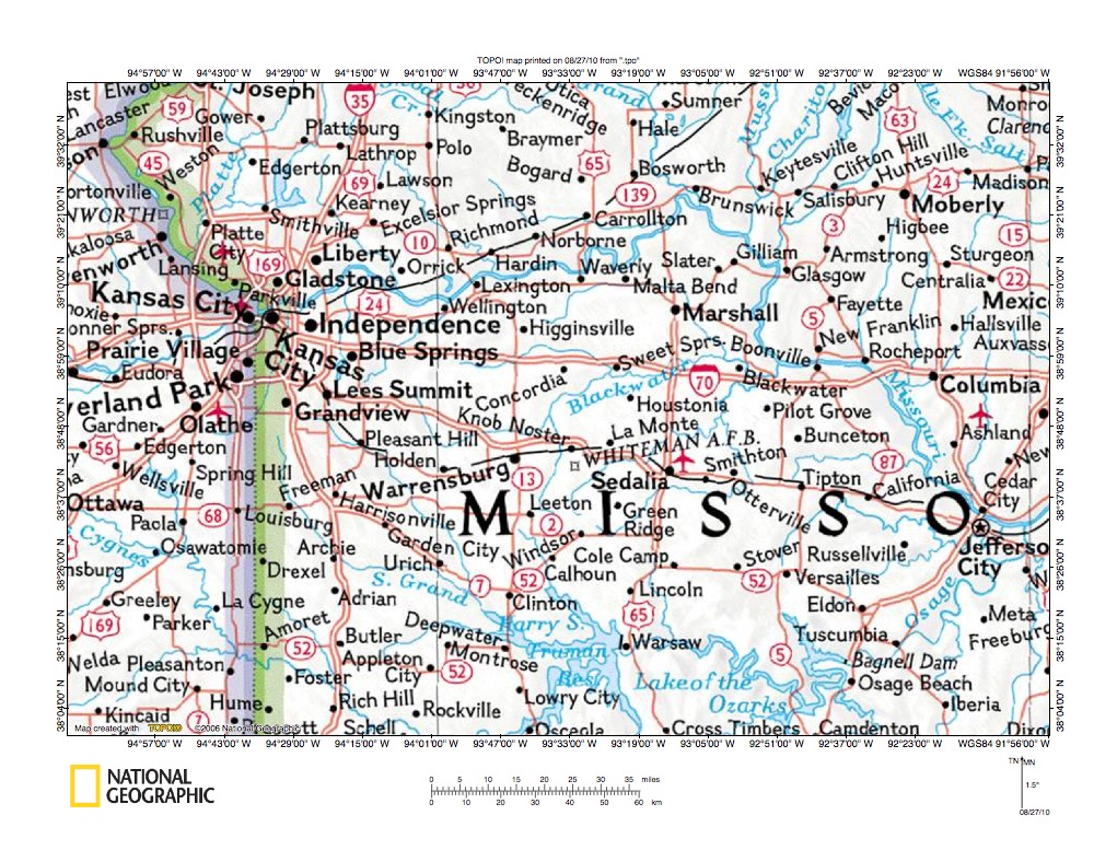Figure 1: Missouri River-Osage River drainage divide area location map (select and click on maps to enlarge). National Geographic Society map digitally presented using National Geographic Society TOPO software.