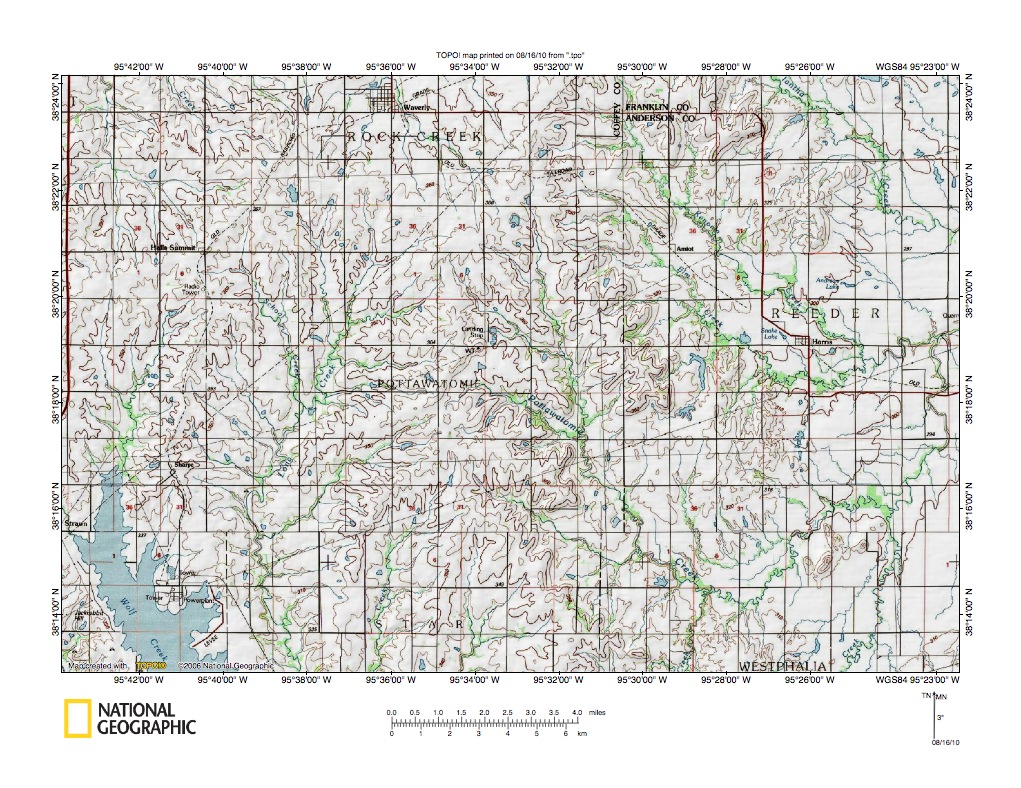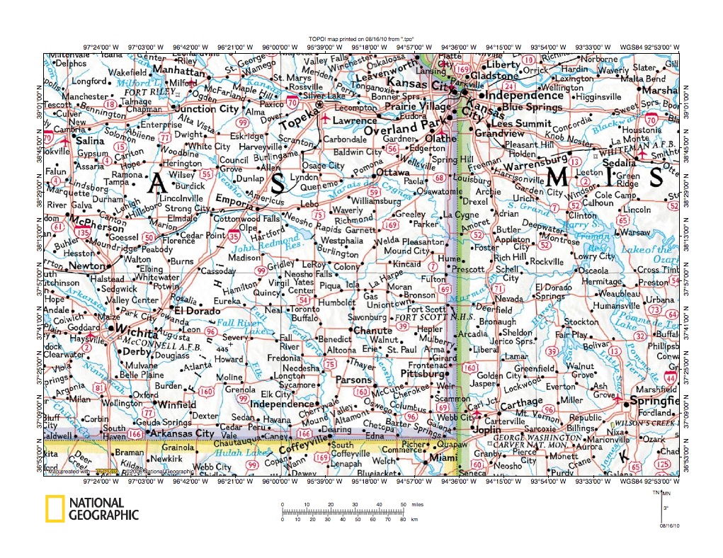 Figure 1: Pottawatomie Creek-Neosho River drainage divide area location map (select and click on maps to enlarge). National Geographic Society map digitally presented using National Geographic Society TOPO software.
