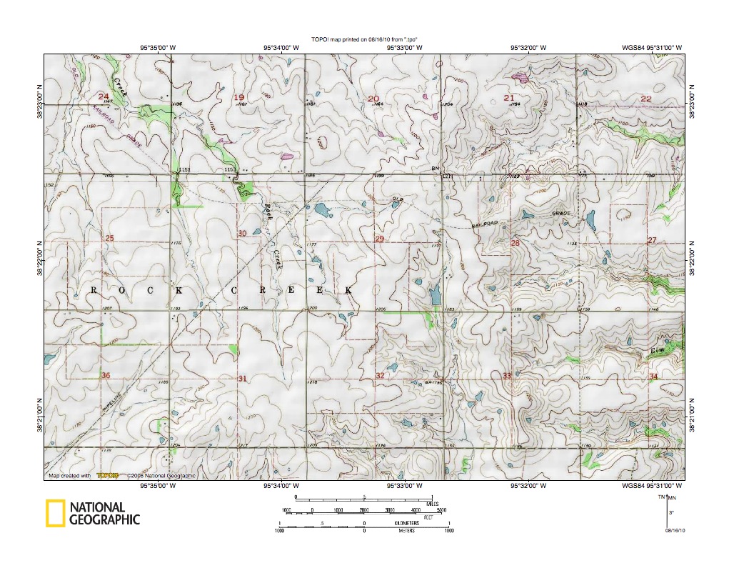 Figure 4: Detailed map of Rock Creek-Pottawatomie Creek drainage divide area. United States Geological Survey map digitally presented using National Geographic Society TOPO software.