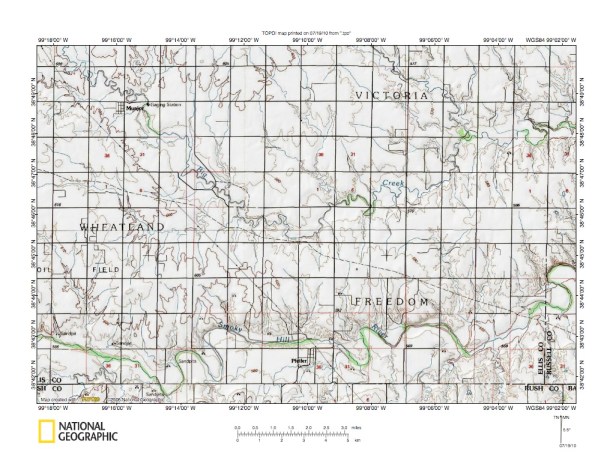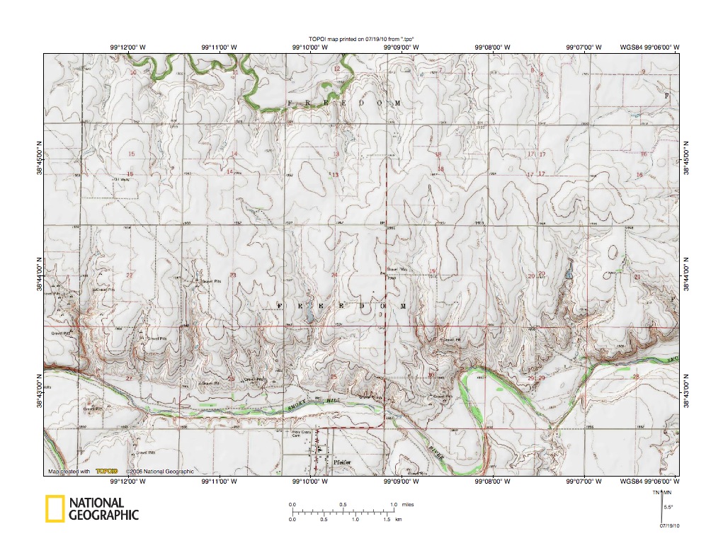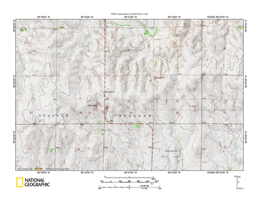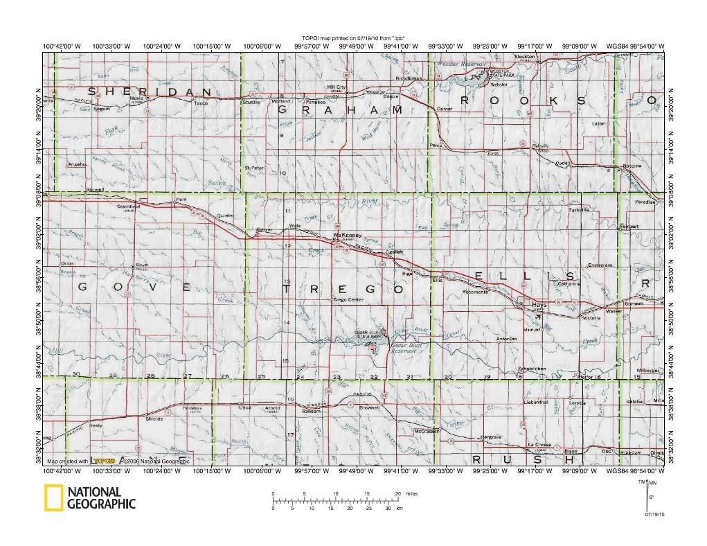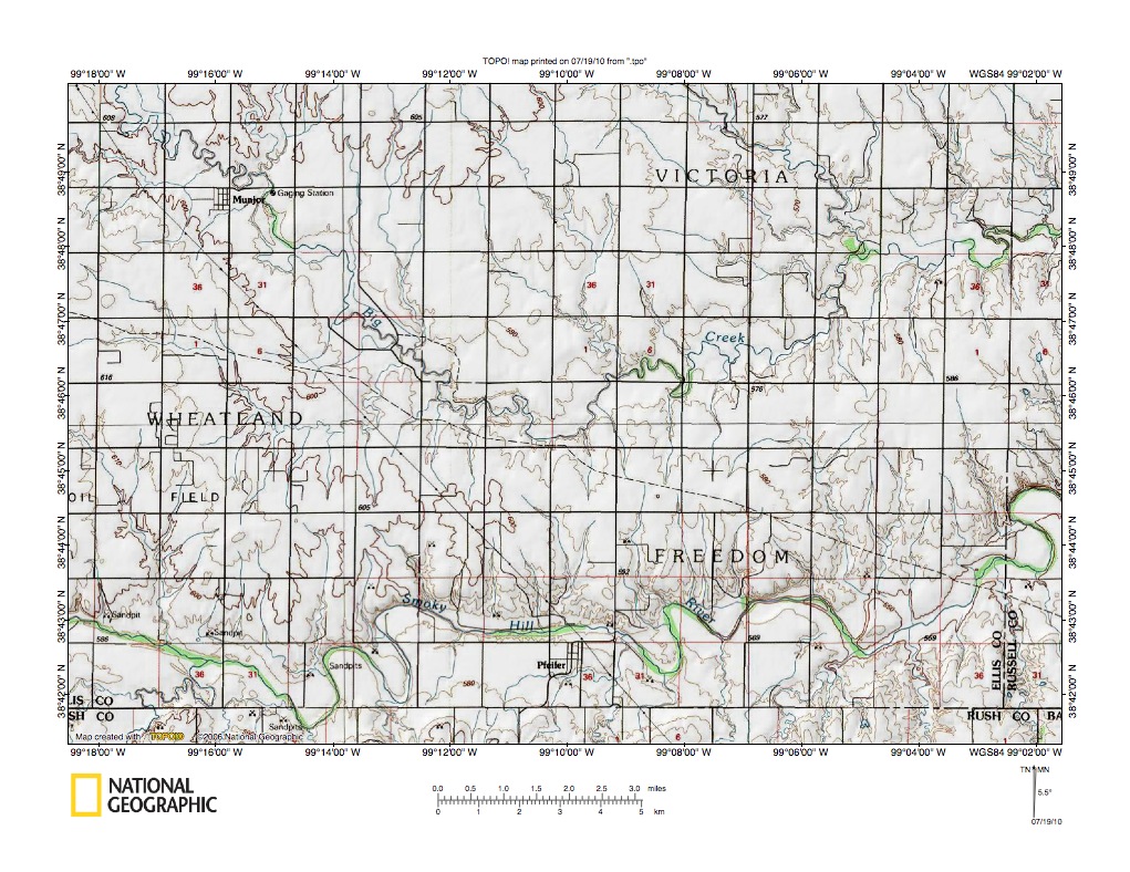 Figure 7: Big Creek-Smoky Hill River drainage divide area near Trego Center, Kansas. United States Geological Survey map digitally presented using National Geographic Society TOPO software.