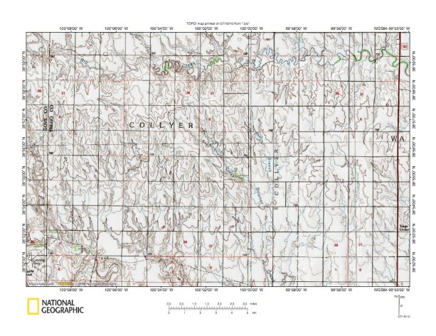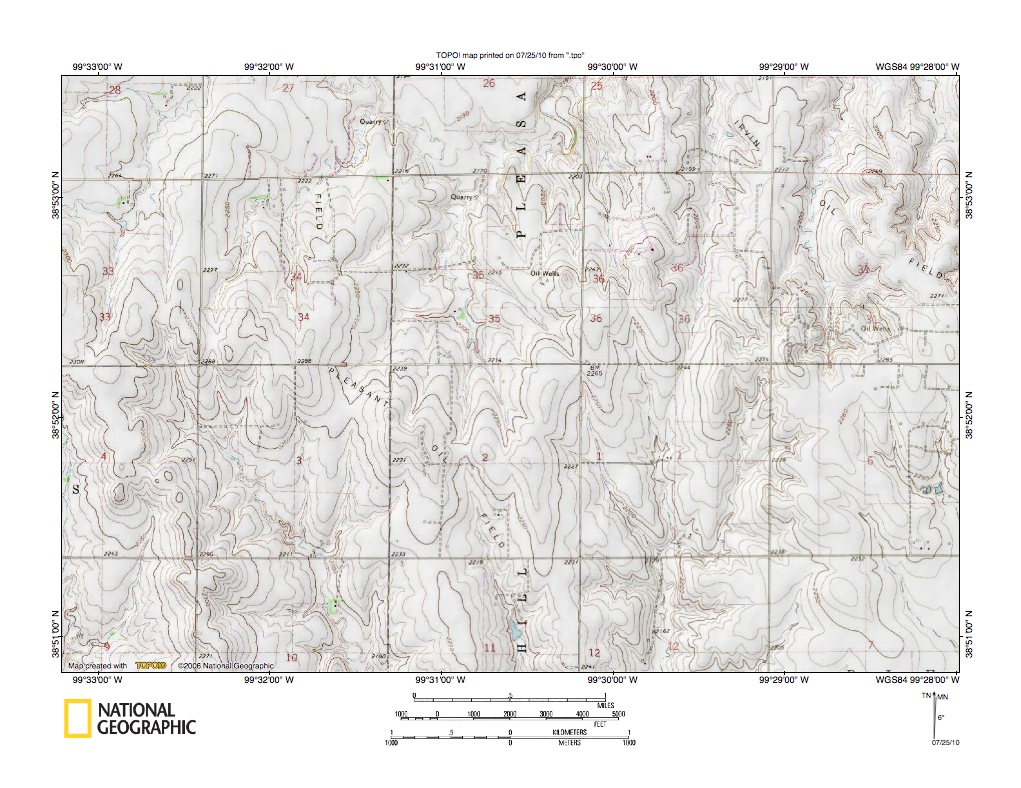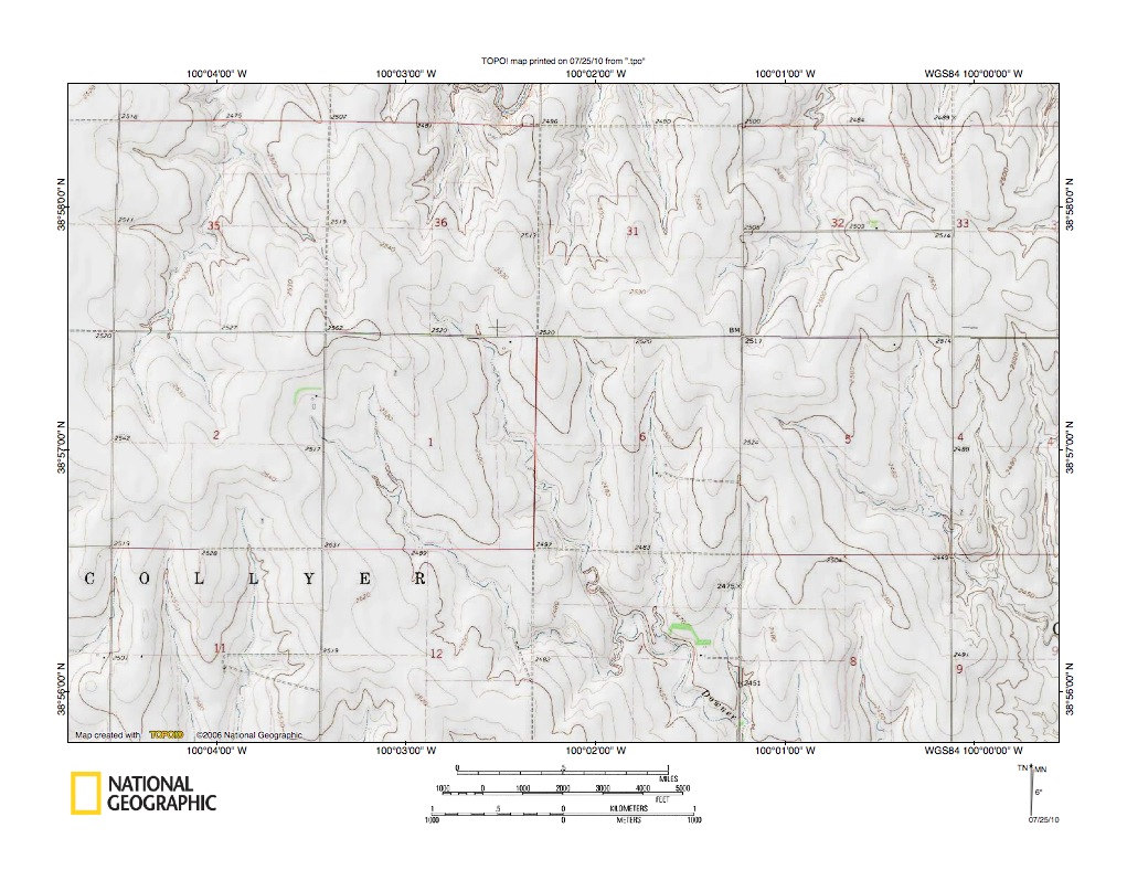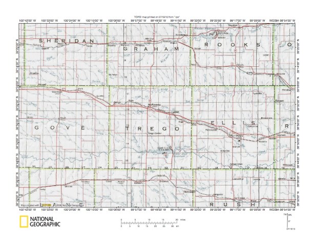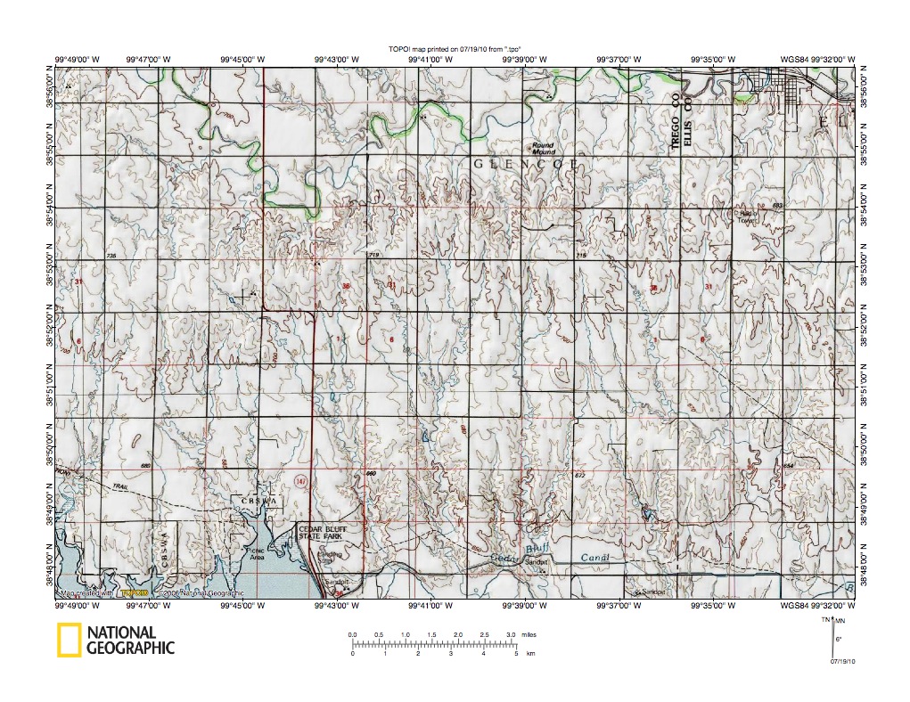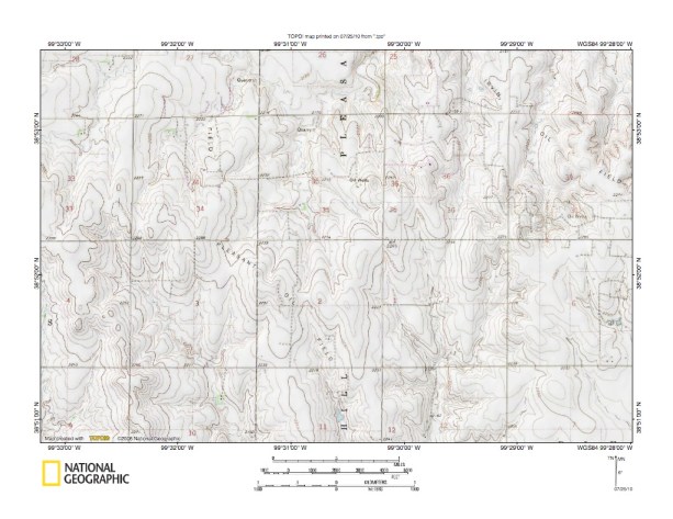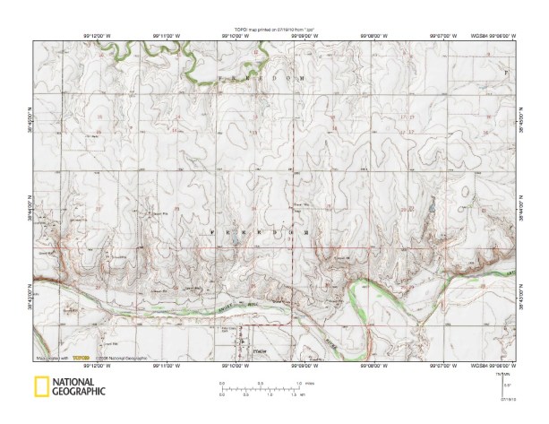 Figure 7: Big Creek-Smoky Hill River drainage divide area near Trego Center, Kansas. United States Geological Survey map digitally presented using National Geographic Society TOPO software.