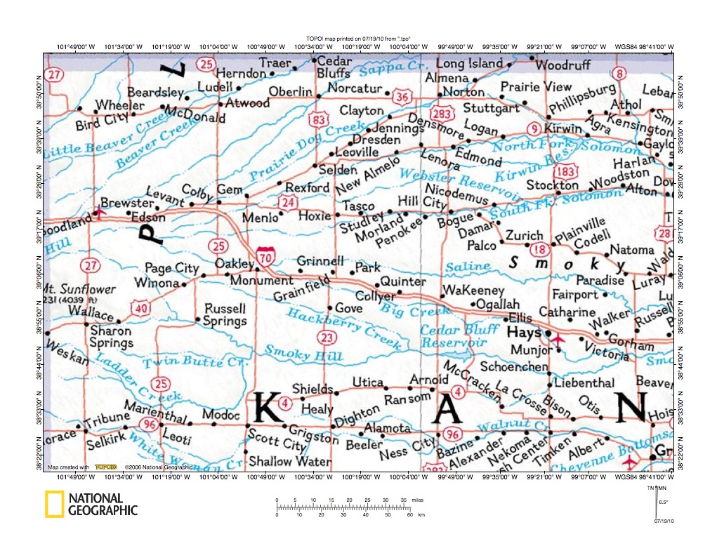 Figure 1: Big Creek-Smoky Hill River drainage divide area location map (select and click on maps to enlarge). National Geographic Society map digitally presented using National Geographic Society TOPO software.