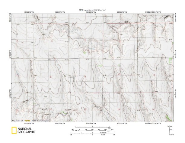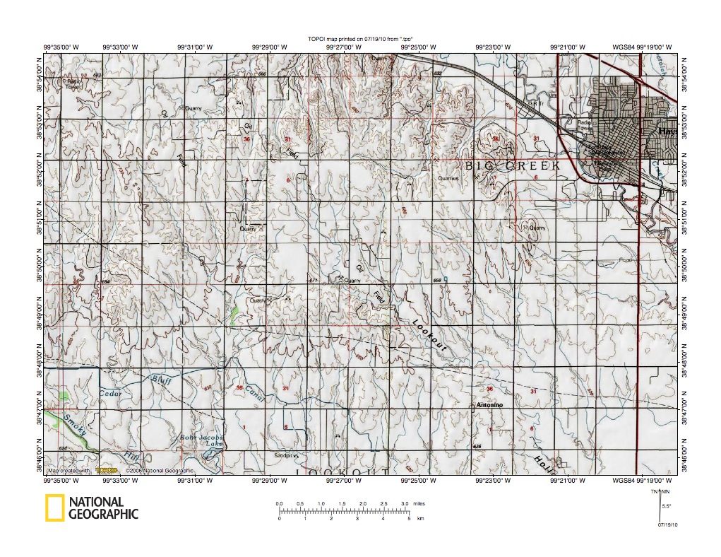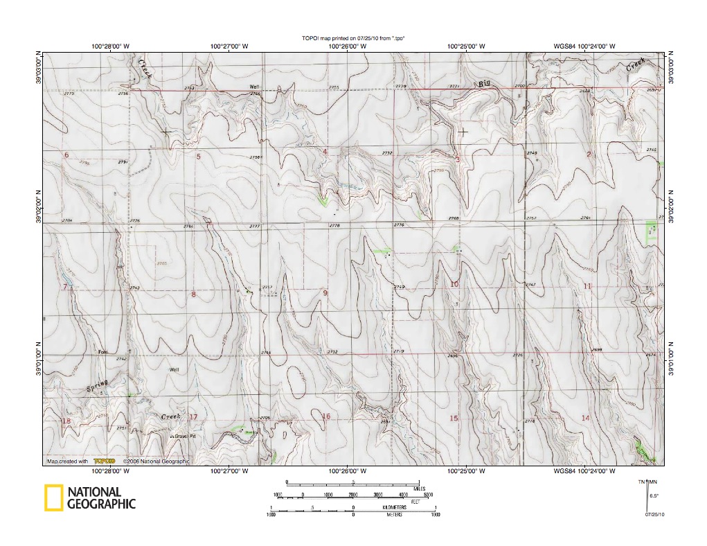Figure 5: Big Creek-Smoky Hill River drainage divide area west of Hays, Kansas. United States Geological Survey map digitally presented using National Geographic Society TOPO software.