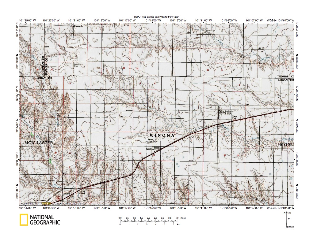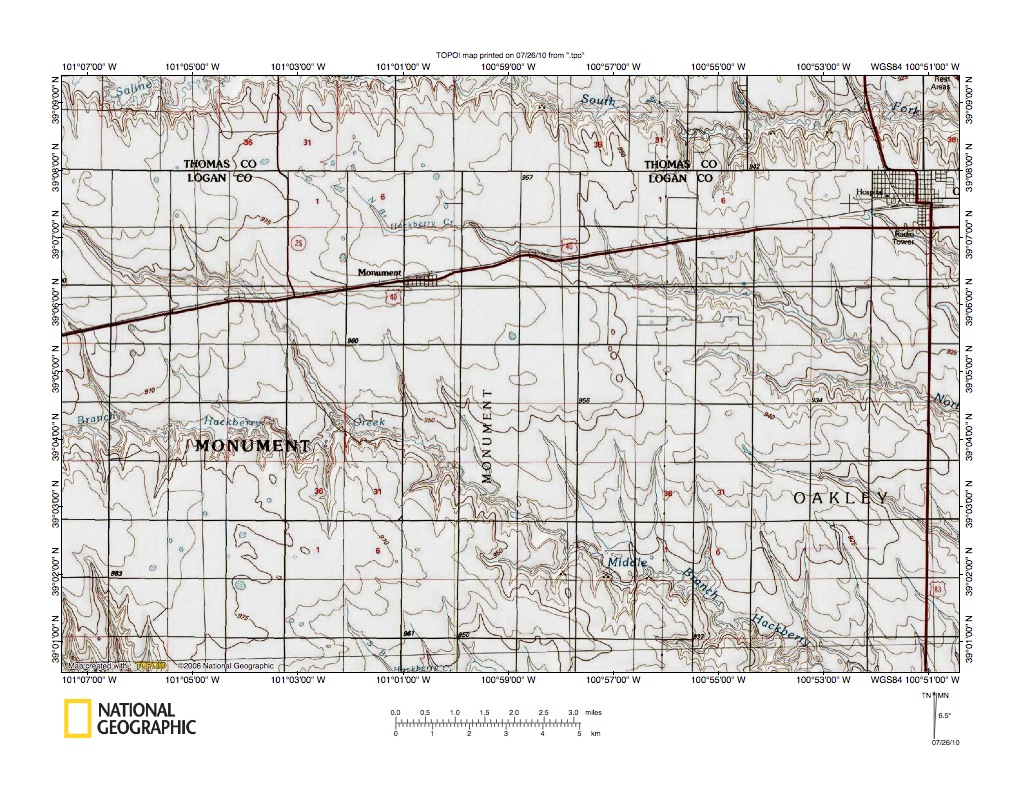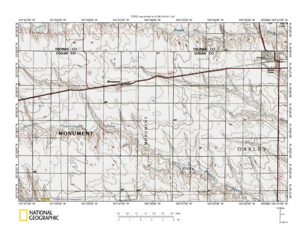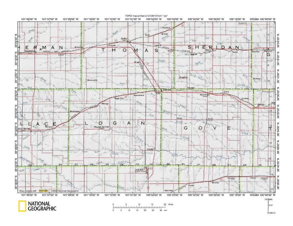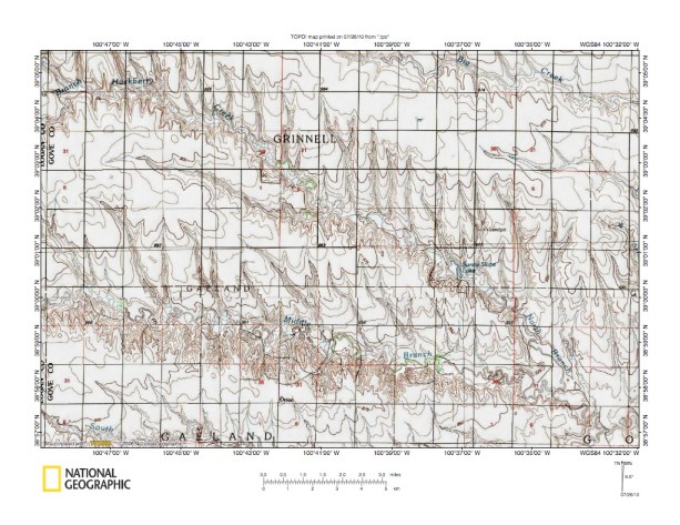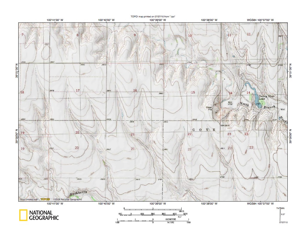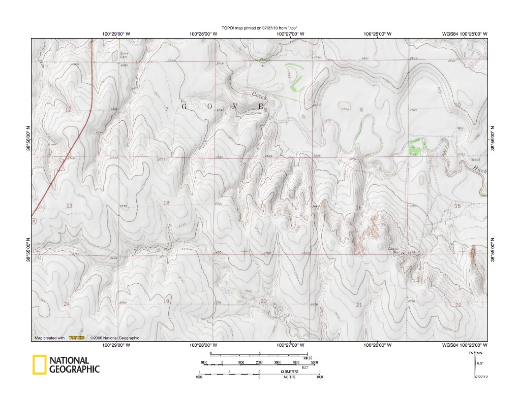 Figure 5: Hackberry Creek-Indian Creek drainage divide area near Gove City. United States Geological Survey map digitally presented using National Geographic Society TOPO software.
