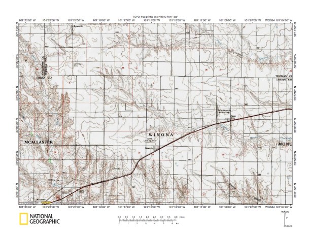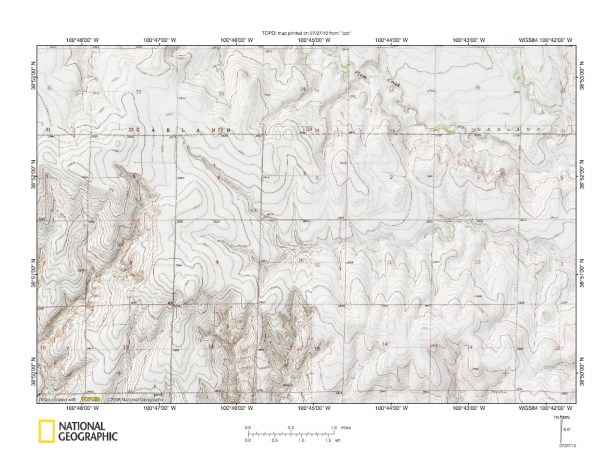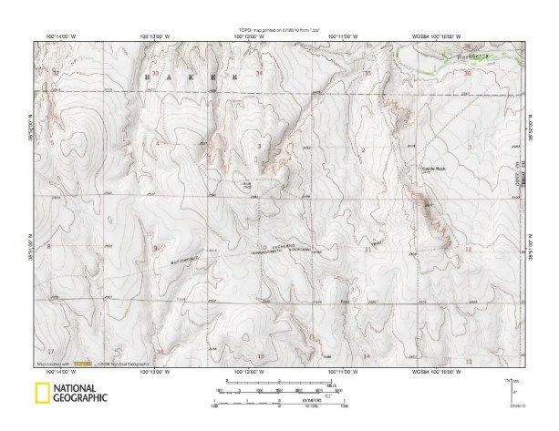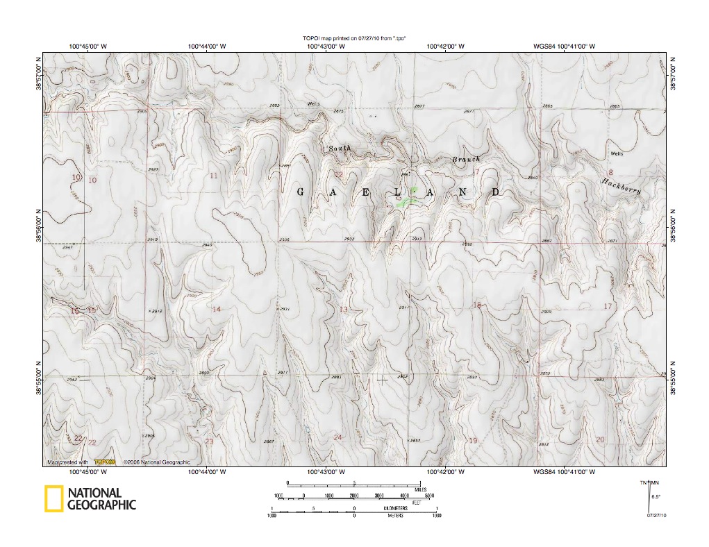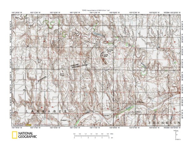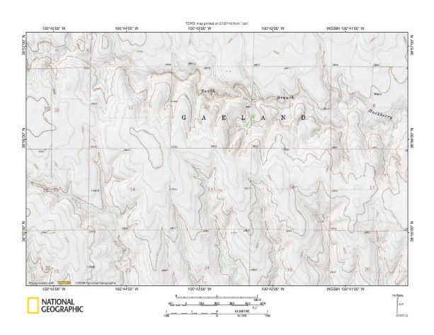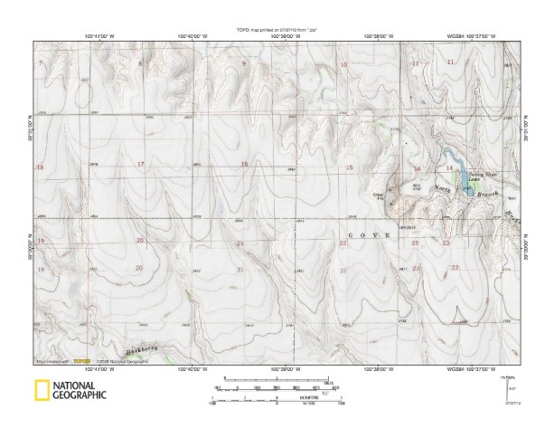 Figure 10: North Fork Smoky Hill River-Middle Branch Hackberry Creek drainage divide area. United States Geological Survey map digitally presented using National Geographic Society TOPO software.