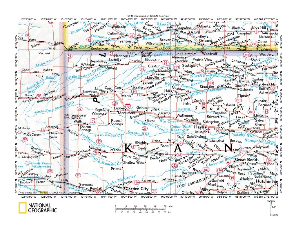 Figure 1: Hackberry Creek-Smoky Hill River drainage divide area location map (select and click on maps to enlarge). National Geographic Society map digitally presented using National Geographic Society TOPO software.