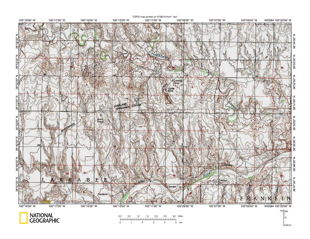 Figure 4: Detailed map of Hackberry Creek-Smoky Hill River drainage divide area near Castle Rock. United States Geological Survey map digitally presented using National Geographic Society TOPO software.