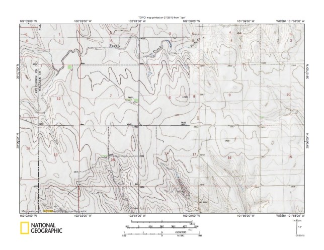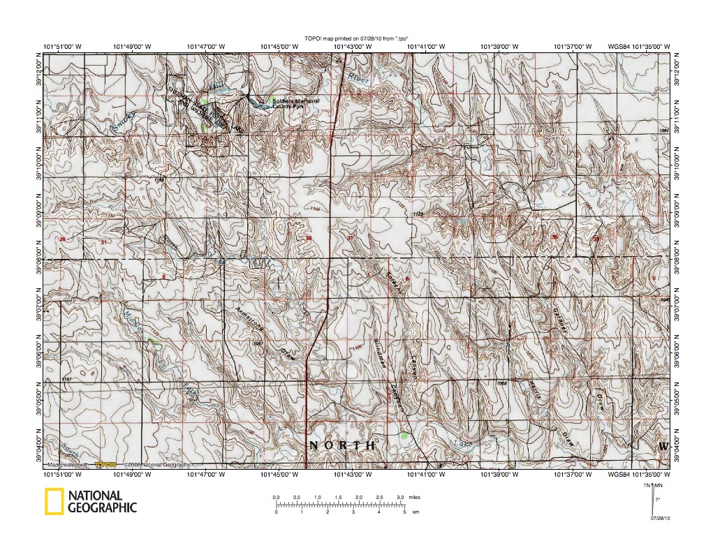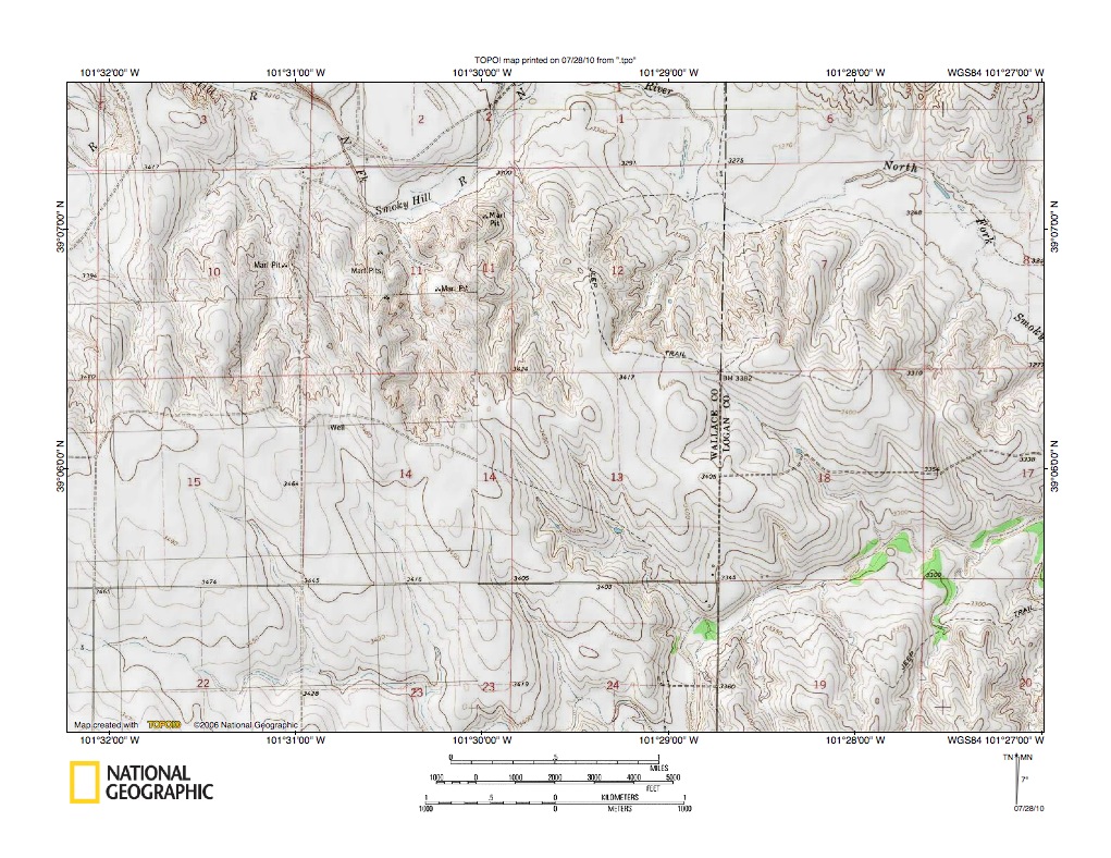 Figure 6: North Fork Smoky Hill River-Lake Creek drainage divide area. United States Geological Survey map digitally presented using National Geographic Society TOPO software.