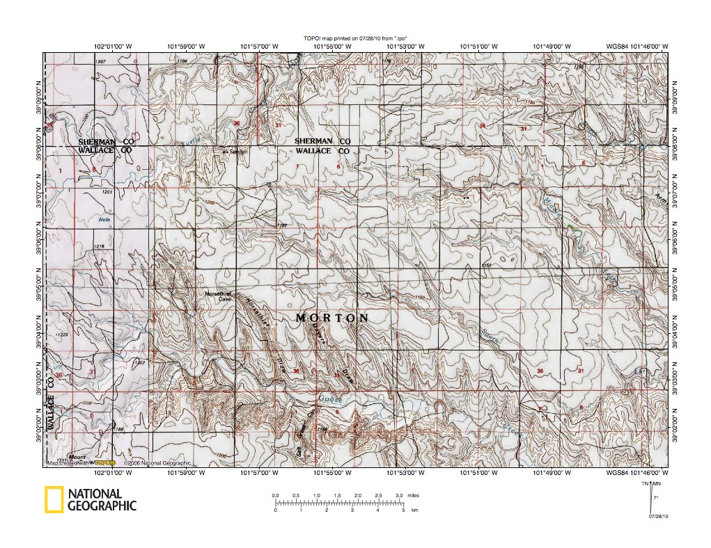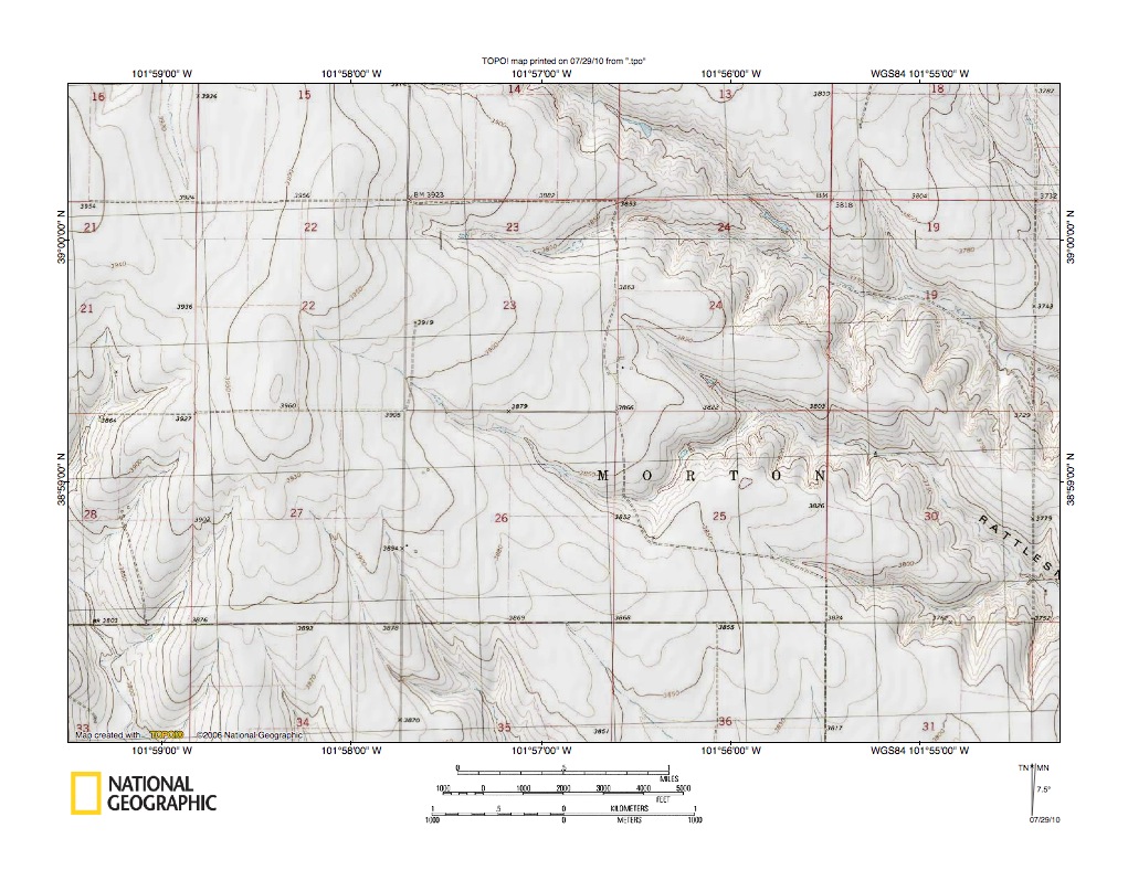 Figure 8: South Beaver Creek-North Fork Smoky Hill River drainage divide area. United States Geological Survey map digitally presented using National Geographic Society TOPO software.