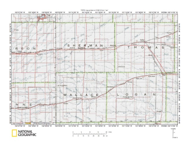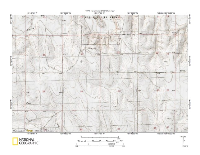 Figure 1: North Fork Smoky Hill River-Smoky Hill River drainage divide area location map (select and click on maps to enlarge). National Geographic Society map digitally presented using National Geographic Society TOPO software.