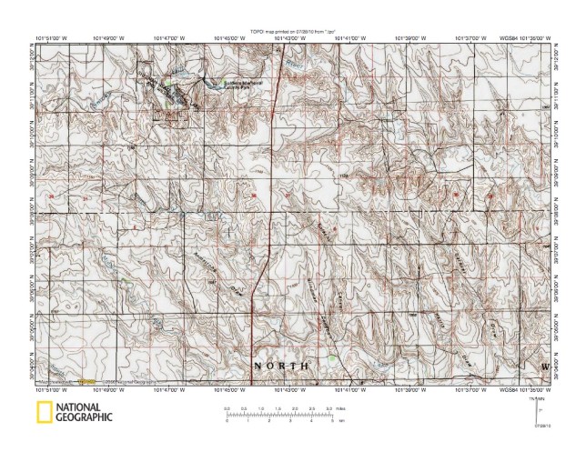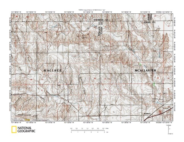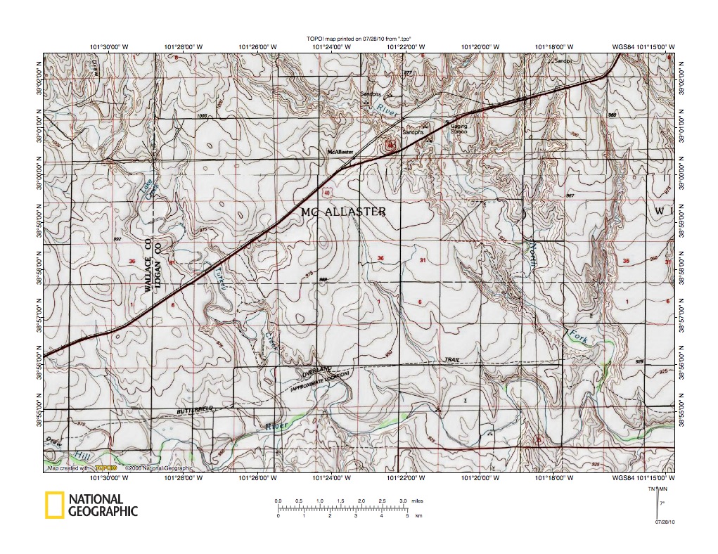Figure 5: Detailed map of North Fork Smoky Hill River-North Fork Smoky Hill River tributary drainage divide area north of McAllaster. United States Geological Survey map digitally presented using National Geographic Society TOPO software.