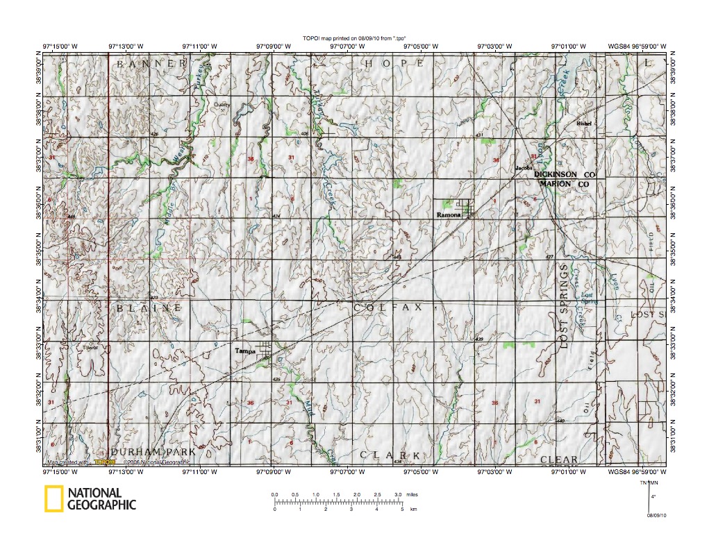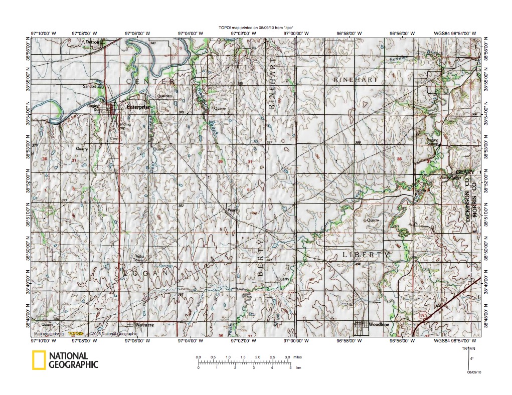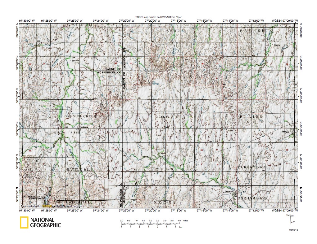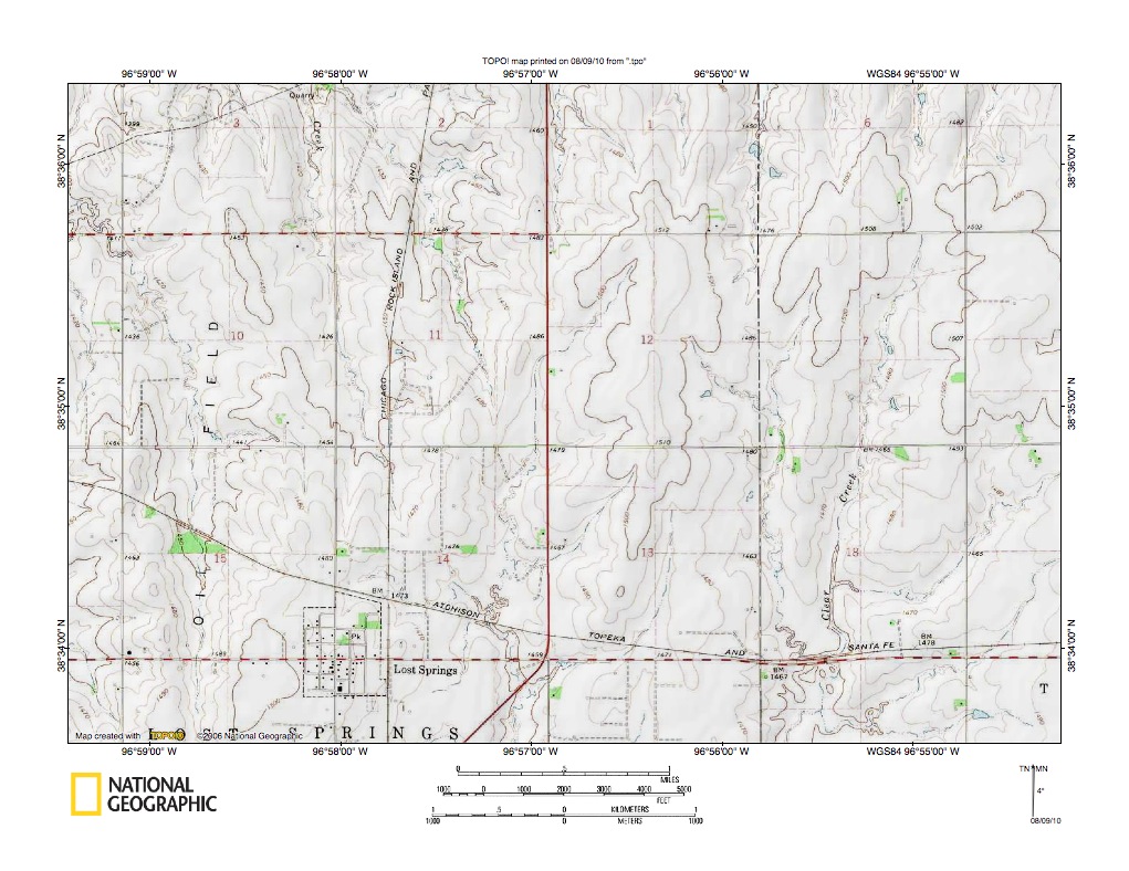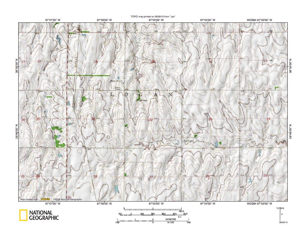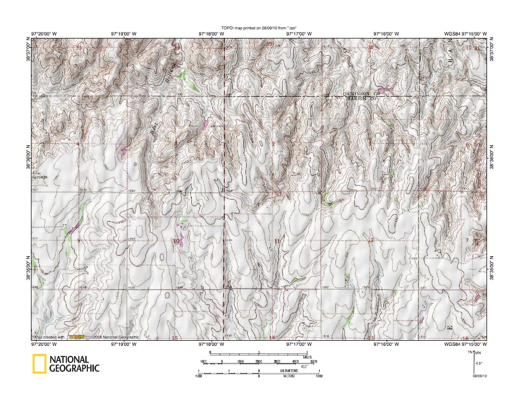 Figure 10: Smoky Hill River-Carry Creek drainage divide area. United States Geological Survey map digitally presented using National Geographic Society TOPO software.