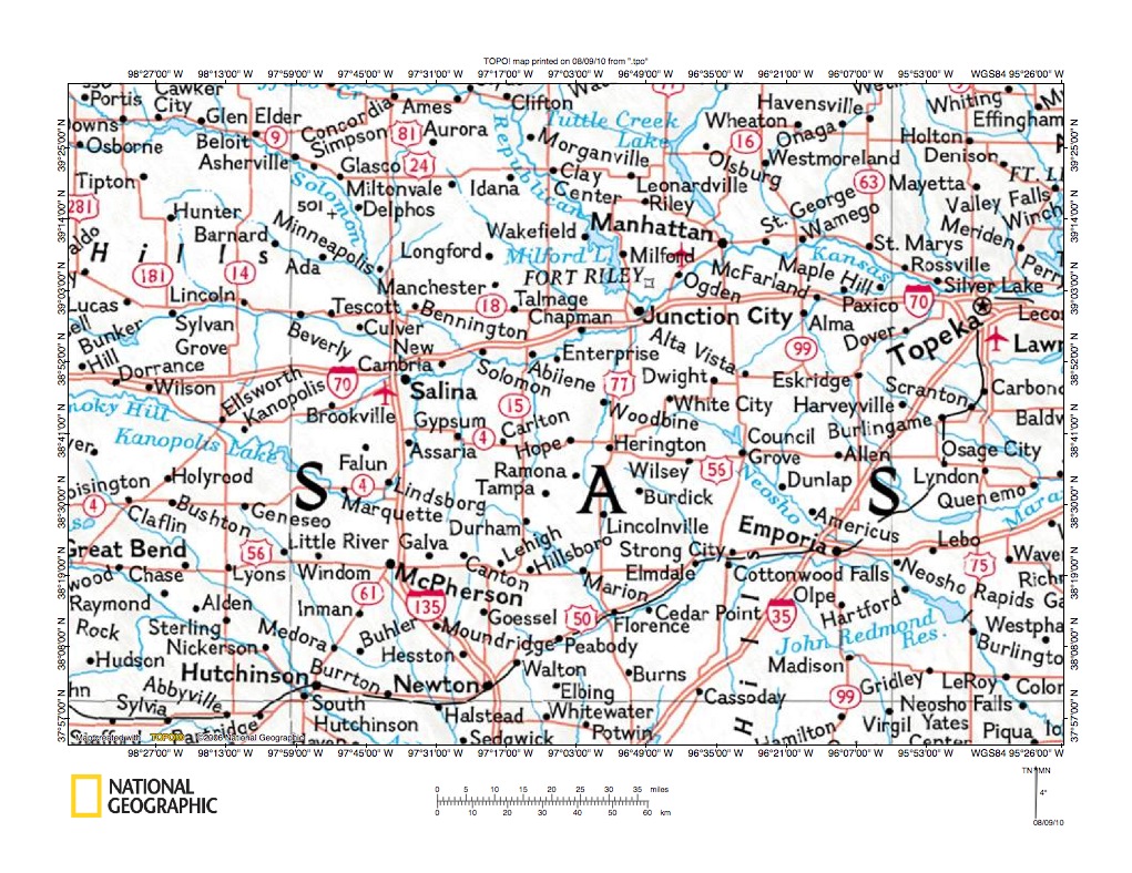 Figure 1: Smoky Hill River-North Cottonwood River drainage divide area location map (select and click on maps to enlarge). National Geographic Society map digitally presented using National Geographic Society TOPO software.