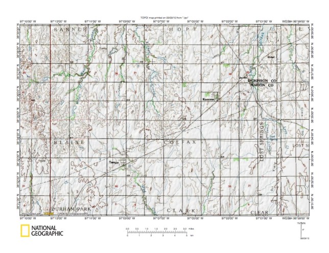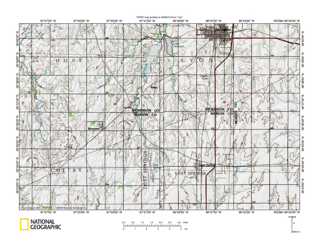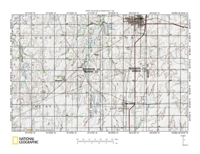 Figure 2: Smoky Hill River-North Cottonwood River drainage divide area detailed location map. United States Geological Survey map digitally presented using National Geographic Society TOPO software.