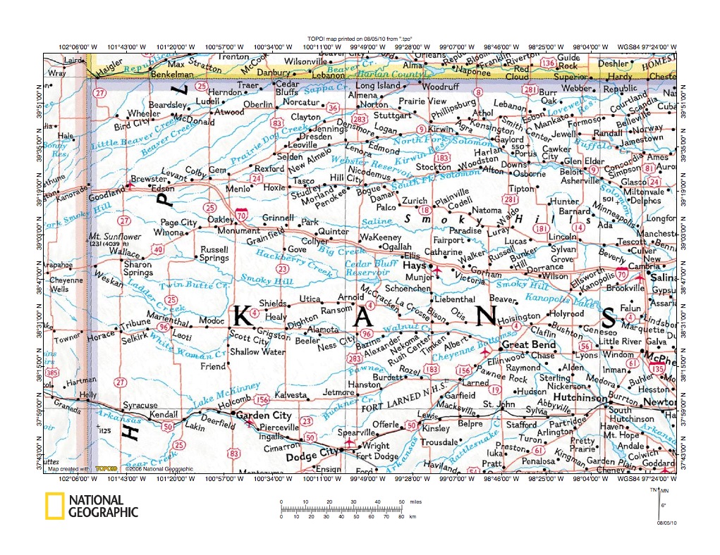 Figure 1: Smoky Hill River-Walnut Creek drainage divide area location map (select and click on maps to enlarge). National Geographic Society map digitally presented using National Geographic Society TOPO software.